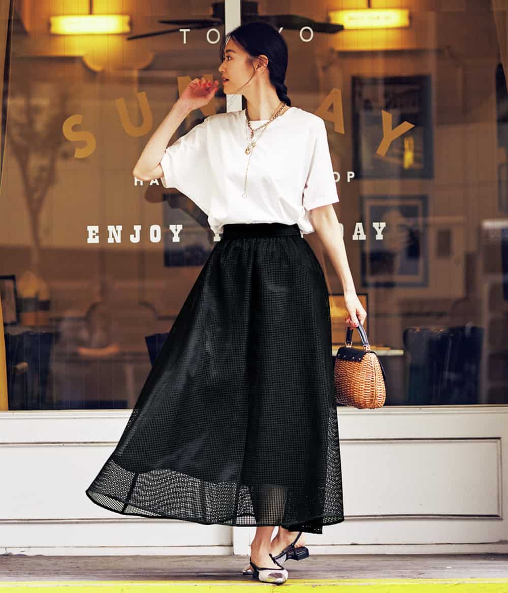 カットワークレースのドラマティックスカート¥13,970(I.T.’S. international)Tシャツ¥12,100(IKITSUKE/IKITSUKE笹塚店)バッグ¥27,500(ヴィオラドーロ/モンテグラート)フラットシューズ¥11,000(アルテミス by ダイアナ/アルテミス by ダイアナ アーバンドックららぽーと豊洲店)ラリエット¥13,200〈イットアトリエ〉コインネックレス¥8,800ロケットペンダント¥13,200〈ともにエイチアッシュ〉(すべてフォーティーン ショールーム)
