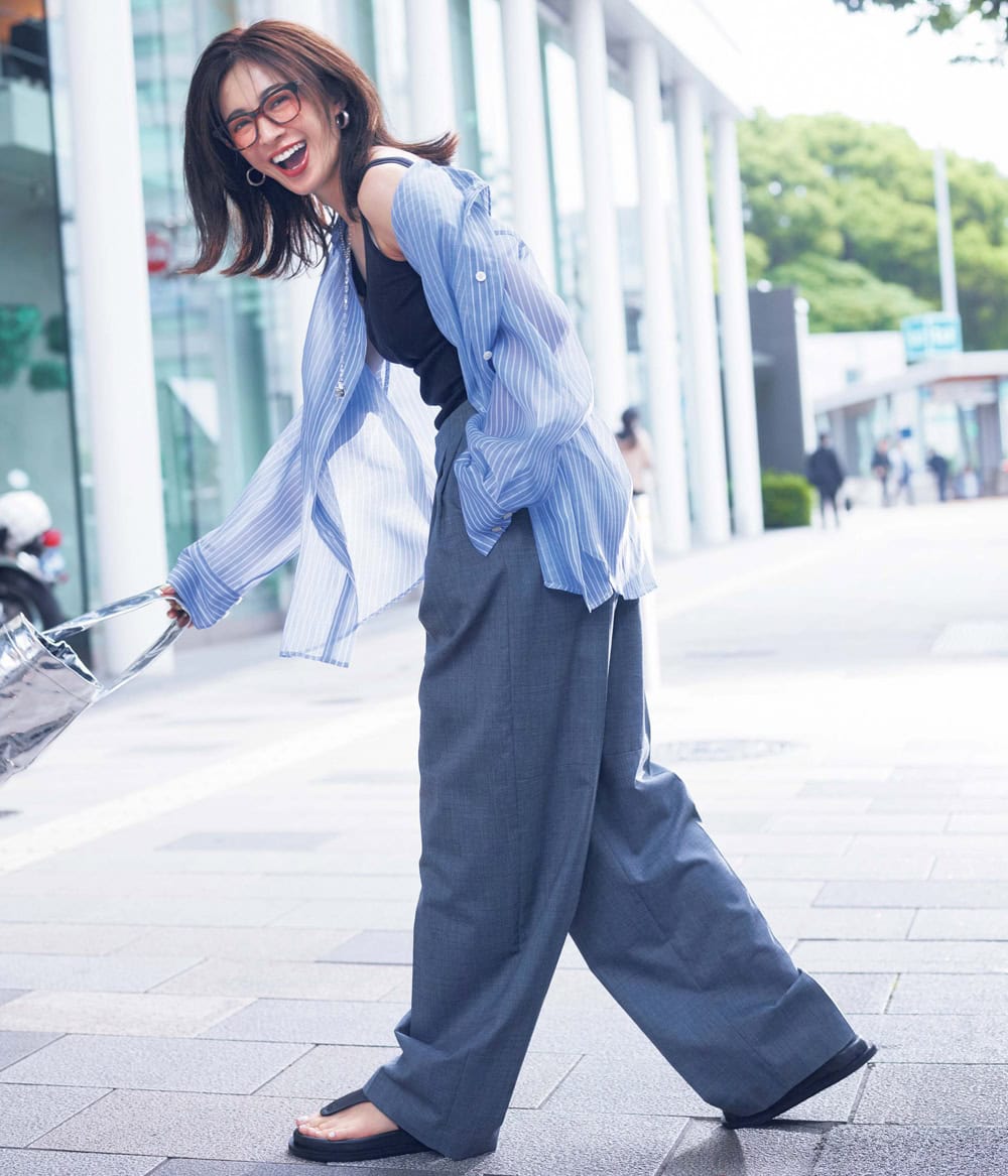 オーガンジーシャツ¥19,910(FRAY I.D/FRAY I.D ルミネ新宿2店)タンクトップ¥17,600パンツ¥35,200(ともにアイレネ/ルシェルブルー総合カスタマーサービス)バッグ¥14,080(バーセルフ)サンダル¥15,400(ワースタジオ/アルアバイル)ピアス¥23,100(ニナ・エ・ジュール/ショールーム ロイト)ネックレス¥75,900(リューク)メガネ¥28,600(ブラン/ライト)