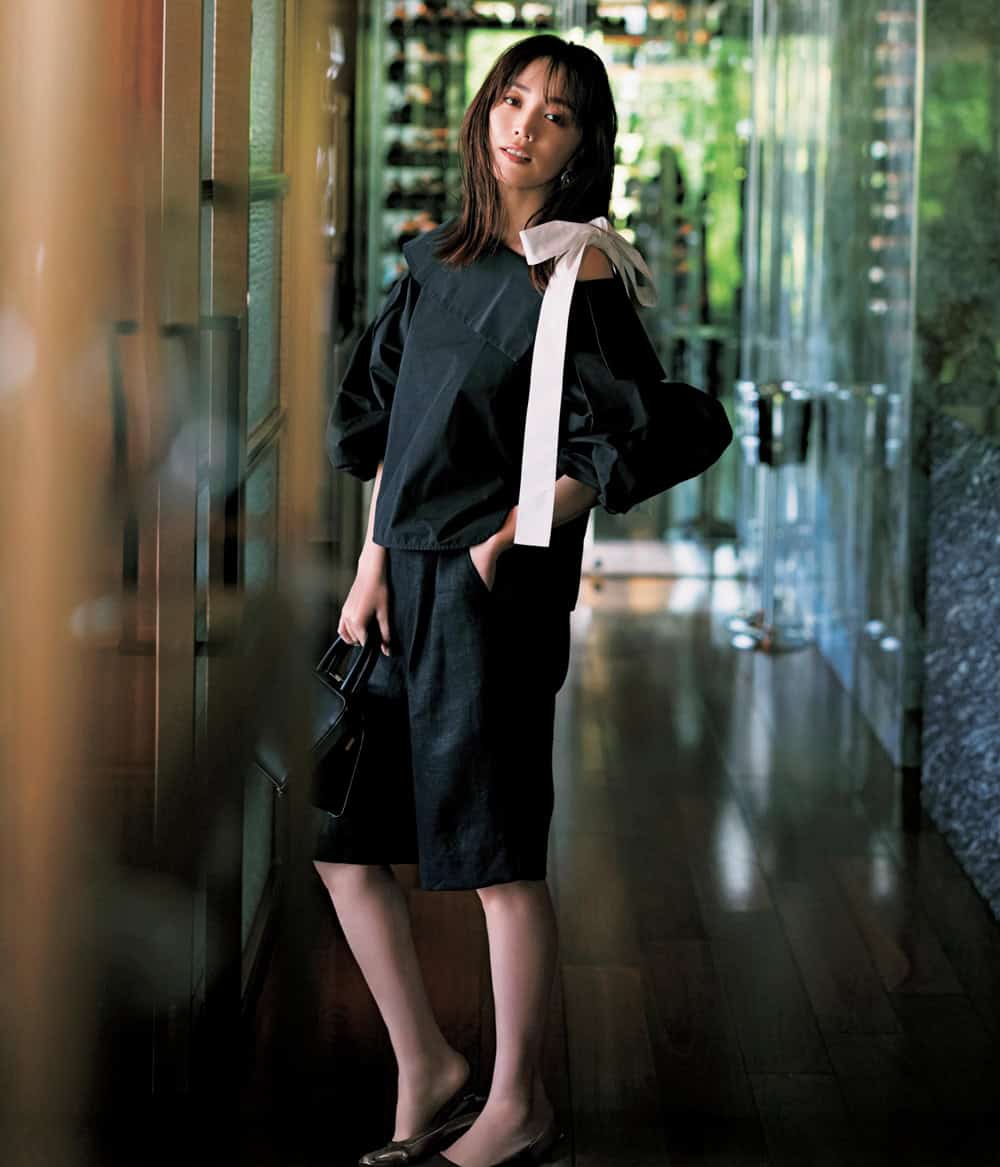 ボリューム袖にビッグリボンがとびきりキュートなリコ(RICO)のブラウスは女子会にぴったり。旬のオフショルダーもセクシーになりすぎず大人の可愛さを堪能できます。ハーフパンツで気負わずヘルシーに着こなして。