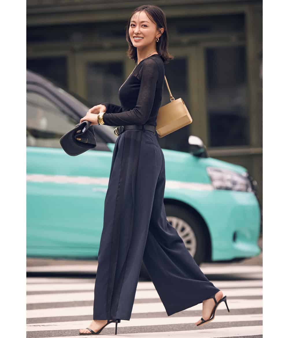 サイドにラインのように施されたオーガンジーが印象的なパンツはスタンブリー(STUMBLY)のもの。ボリュームのあるワイドパンツは体にフィットするトップスが好相性。緩急のバランスを意識した大人のワントーンで残暑も颯爽と。