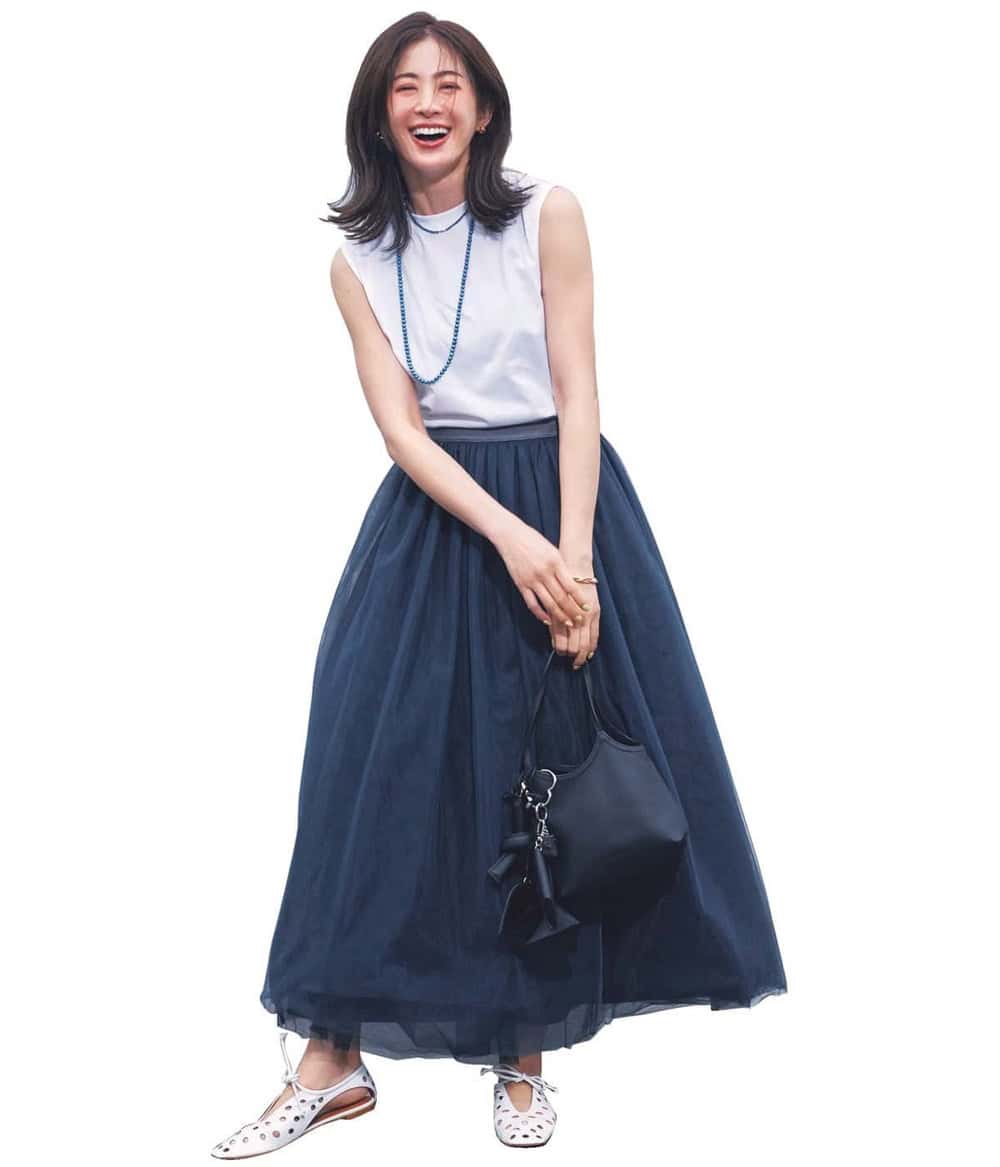 スタイリスト・石毛のりえさんも太鼓判を押すHER.のチュールスカートは黒より日常使いしやすいブルーグレーの色味が肝。シンプルな白Tとのワンツーコーデも一気に華やぎ、お出かけ仕様に。スカートと統一感のあるブルーのカラーパールが夏らしいアクセント。