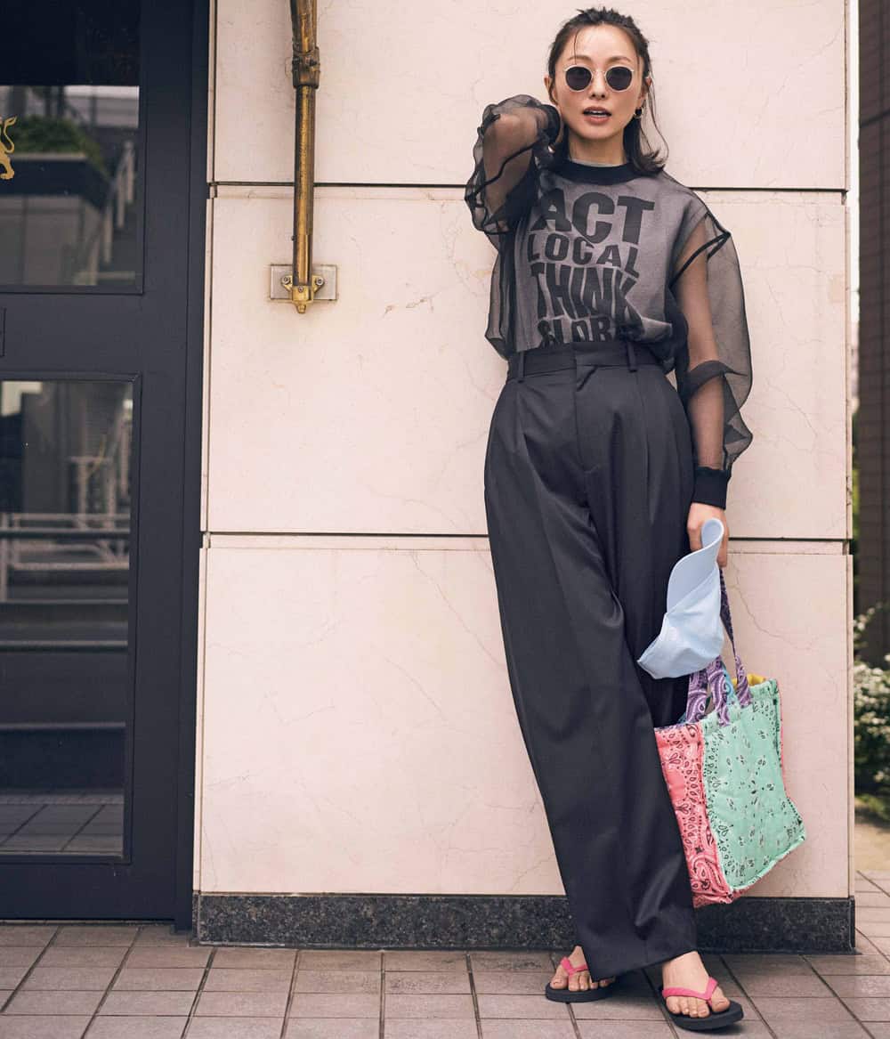 オーガンジーシャツ¥19,910(FRAY I.D/FRAY I.D ルミネ新宿2店)タンクトップ¥17,600パンツ¥35,200(ともにアイレネ/ルシェルブルー総合カスタマーサービス)バッグ¥14,080(バーセルフ)サンダル¥15,400(ワースタジオ/アルアバイル)ピアス¥23,100(ニナ・エ・ジュール/ショールーム ロイト)ネックレス¥75,900(リューク)メガネ¥28,600(ブラン/ライト)