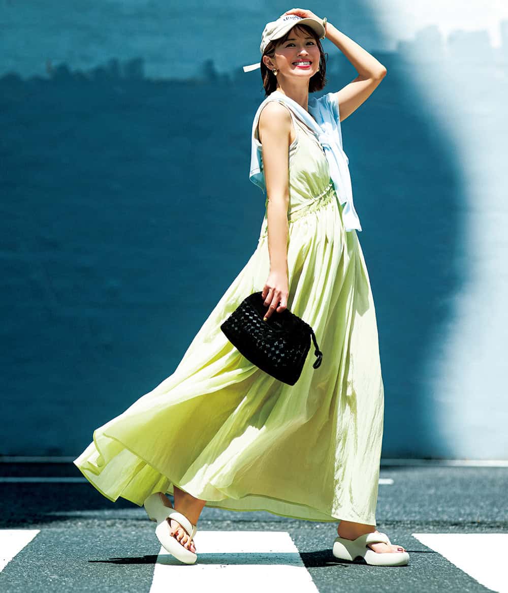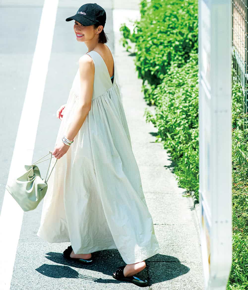 キャップ¥8,250(ザ シンゾーン/シンゾーン ルミネ有楽町店)肩に巻いたカーディガン¥14,300(セルフォード/セルフォード ルミネ新宿2店)ワンピース¥24,200(メゾンスペシャル/メゾンスペシャル 青山店)タンクトップ¥13,200(ティッカ)バッグ¥145,200(ピエール アルディ/ピエール アルディ 東京)サンダル¥17,600(メリッサ/メリッサ シューズ ジャパン)ピアス¥8,800(ゴールデン モンステラ/H 3Oファッションビュロー)ブレスレット¥25,300(ワンエーアールバイウノアエレ/ウノアエレ ジャパン)