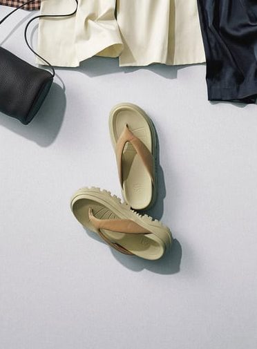 ボリュームのあるトングサンダルは「柔らかカラー」が今年っぽい