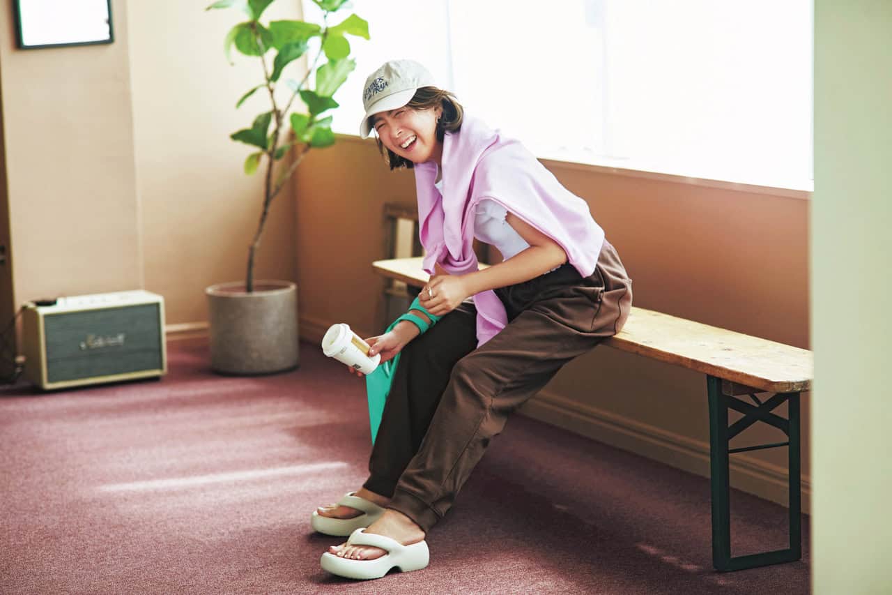 サンダル¥17,600(メリッサ/メリッサ シューズ ジャパン)Tシャツ¥2,420(ヘインズ/ヘインズブランズ ジャパン カスタマーセンター)肩に巻いたスウェット¥4,048パンツ¥5,445マルシェバッグ¥2,310(すべてユナイテッドアスレ/キャブ)キャップ¥8,250(ザ シンゾーン/シンゾーン ルミネ有楽町店)ピアス、リング/本人私物