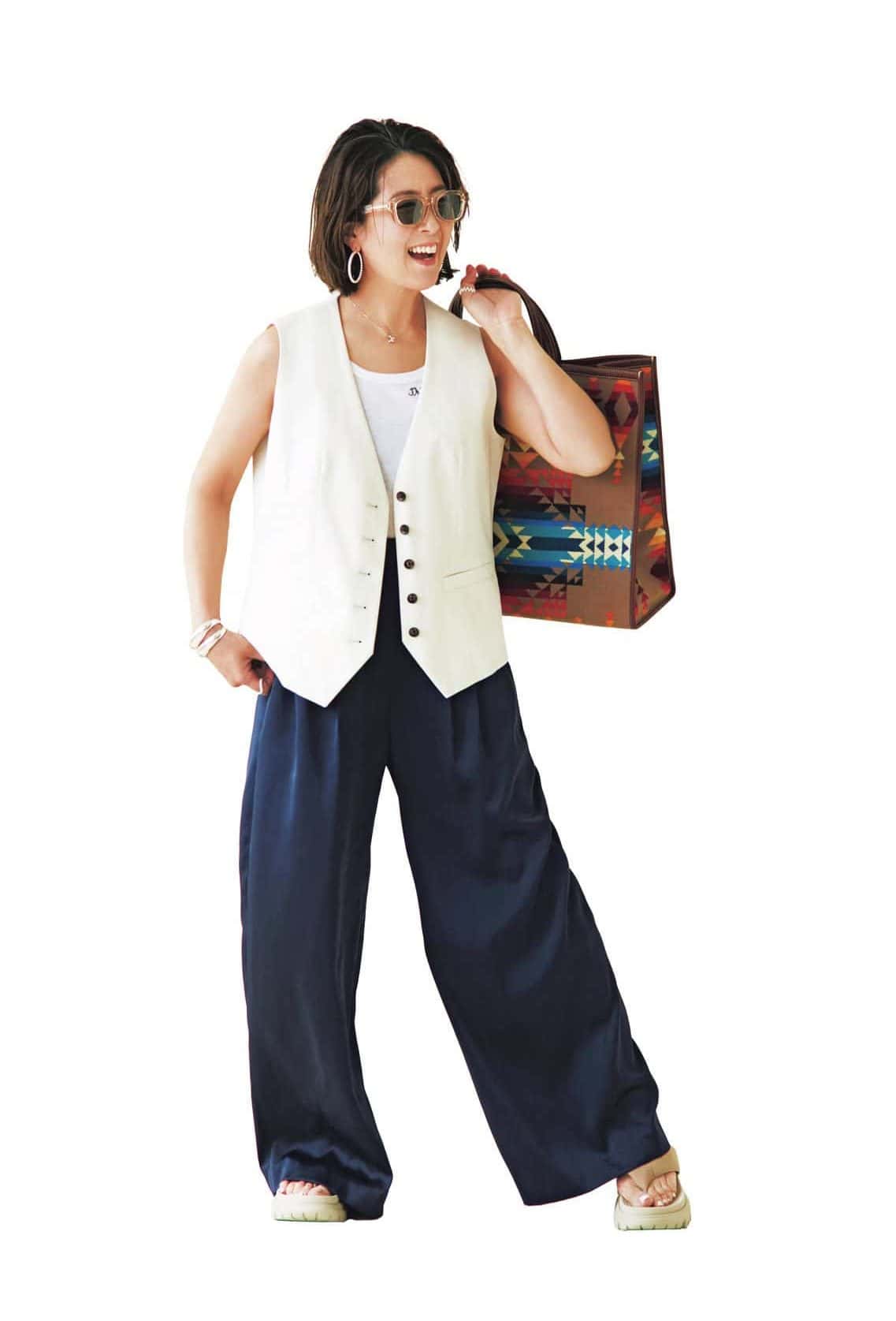 サンダル¥15,400(シャカ/ブルームーンカンパニー)ジレ¥27,500(ザ シンゾーン/シンゾーン ルミネ有楽町店)タンクトップ¥7,700※グレーと2枚セット価格(サードマガジン×フルーツオブザルーム/サードマガジン)パンツ¥20,900(アルページュストーリー)バッグ¥84,700(ア ヴァケーション/ノーベルバ ピアス¥12,100(ウノアエレ/ウノアエレジャパン)リング¥14,300(ラムダ)バングル¥27,500(フィリップ オーディベール/マルティニーク ルミネ横浜)サングラス¥35,200(ブラン/ライト)