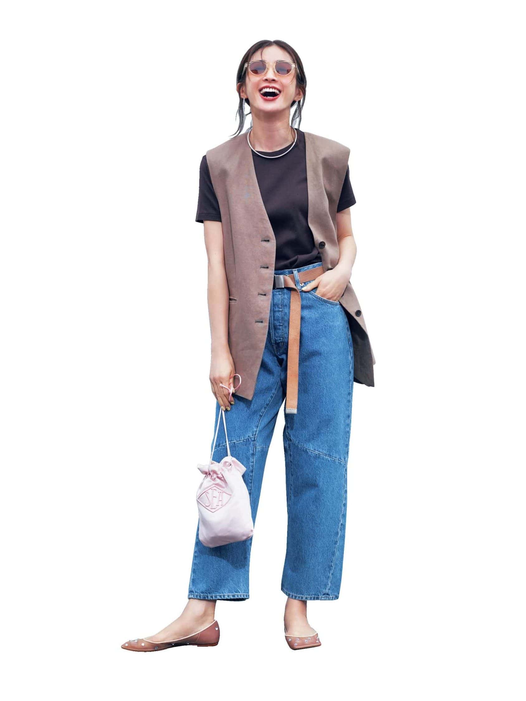 ジレ¥57,200(サクラ/インターリブ)Tシャツ¥5,280(ミラ オーウェン/ミラ オーウェン ルミネ新宿2店)デニムパンツ¥24,200(ローラス/ジャック・オブ・オール・トレーズ プレスルーム)バッグ¥19,800(シー/エスストア)シューズ¥39,600(ピッピシック/ベイジュ)ベルト¥9,900(ハァウ/ウィム ガゼット 玉川髙島屋S・C店)ピアス¥25,300(マリハ)ネックレス¥86,900(ニナ・エ・ジュール/ショールーム ロイト)サングラス¥40,700(ブラン/ライト)