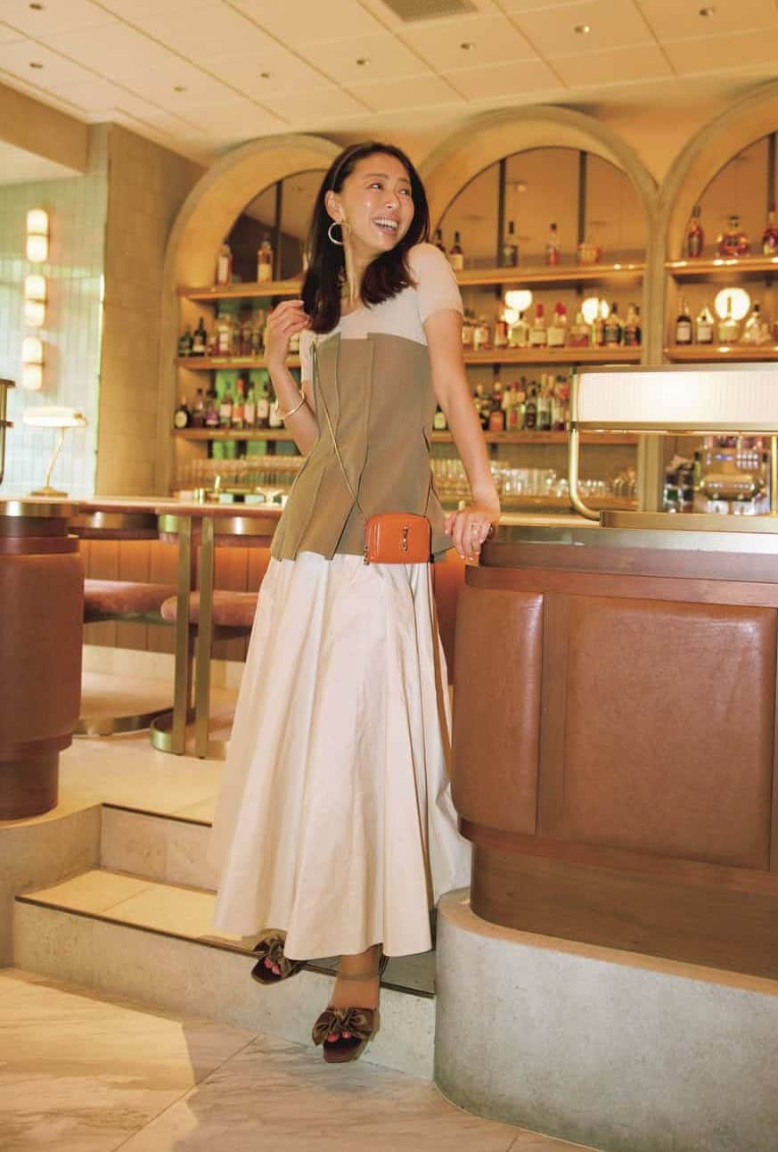 一枚では見た目が寂しくなりがちな白Tシャツには、構築的なデザインのビスチェを合わせて一気にトレンド感を。ノーカラーのシンプルなTシャツをインナーにすることで、エレガントなビスチェとスカートとの組み合わせも華やかすぎず、ほどよくまとまります。ビスチェは気になるお腹周りのカバー力も◎。