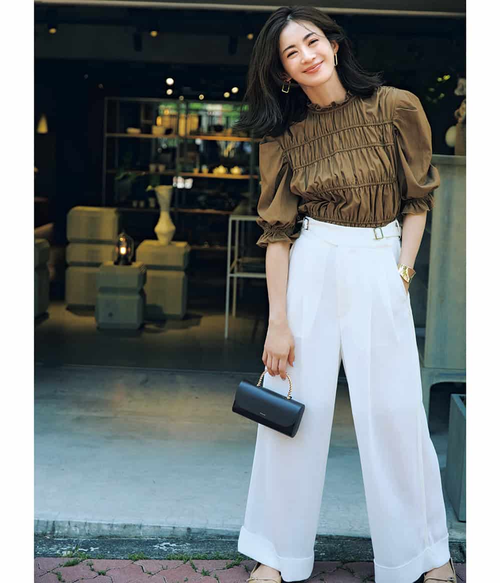 パンツ¥28,600(MIESROHE/MIESROHE ルミネ新宿1店)ブラウス¥9,900(Mila Owen/Mila Owen ルミネ新宿2店)バッグ¥88,000(サルチェ/フラッパーズ)パンプス¥42,900(ヒューン/クルーズ ショールーム)ピアス¥50,600(フェルセラ/ズットホリック)バングル¥11,550(Hh/フォーティーン ショールーム)