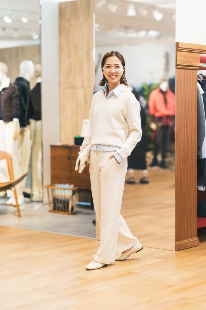 夏の余韻を感じつつ、秋の気分を先取りしたい。でも、この暑さに厚手のものは…という人に、おすすめしたいのがニットパンツ。軽やかで柔らかい穿き心地が重すぎず、立体的なケーブル編みが、どんなファッションにもスパイスを効かせてくれます。同色のざっくりニットと水色のストライプシャツをレイヤードして、ラウンジ感のある大人のリラックススタイルに。