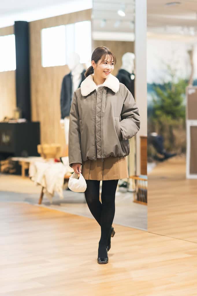 プリーツスコート¥2,990 パフテックジャケット¥12,900 ラウンドウルトラミニバッグ¥1,290 ヒートテックニットリブタイツ ¥1,500(すべてユニクロ) 靴(私物)