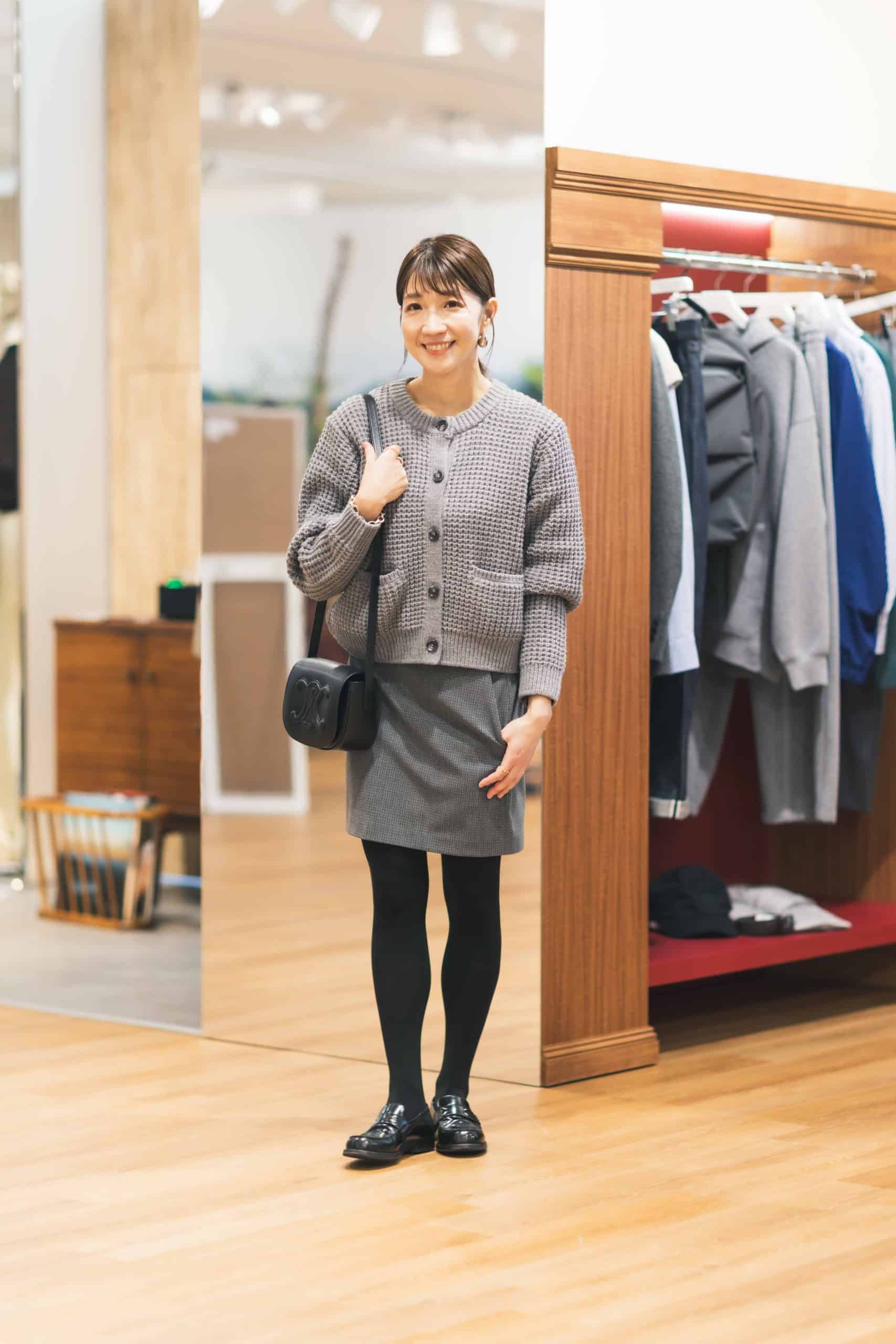大人にとってハードルの高いミニスカートは、タイツで脚をカモフラージュしつつトラッドに着地すれば挑戦しやすい。ディテールを削ぎ落とした糖度低めのデザインだから、子どもっぽい印象に陥ることなく着こなせます。コンパクトなミニスカートには、ふっくらしたワッフル素材のショート丈カーディガンが好バランス。グレーのワントーンでシックに仕上げました。