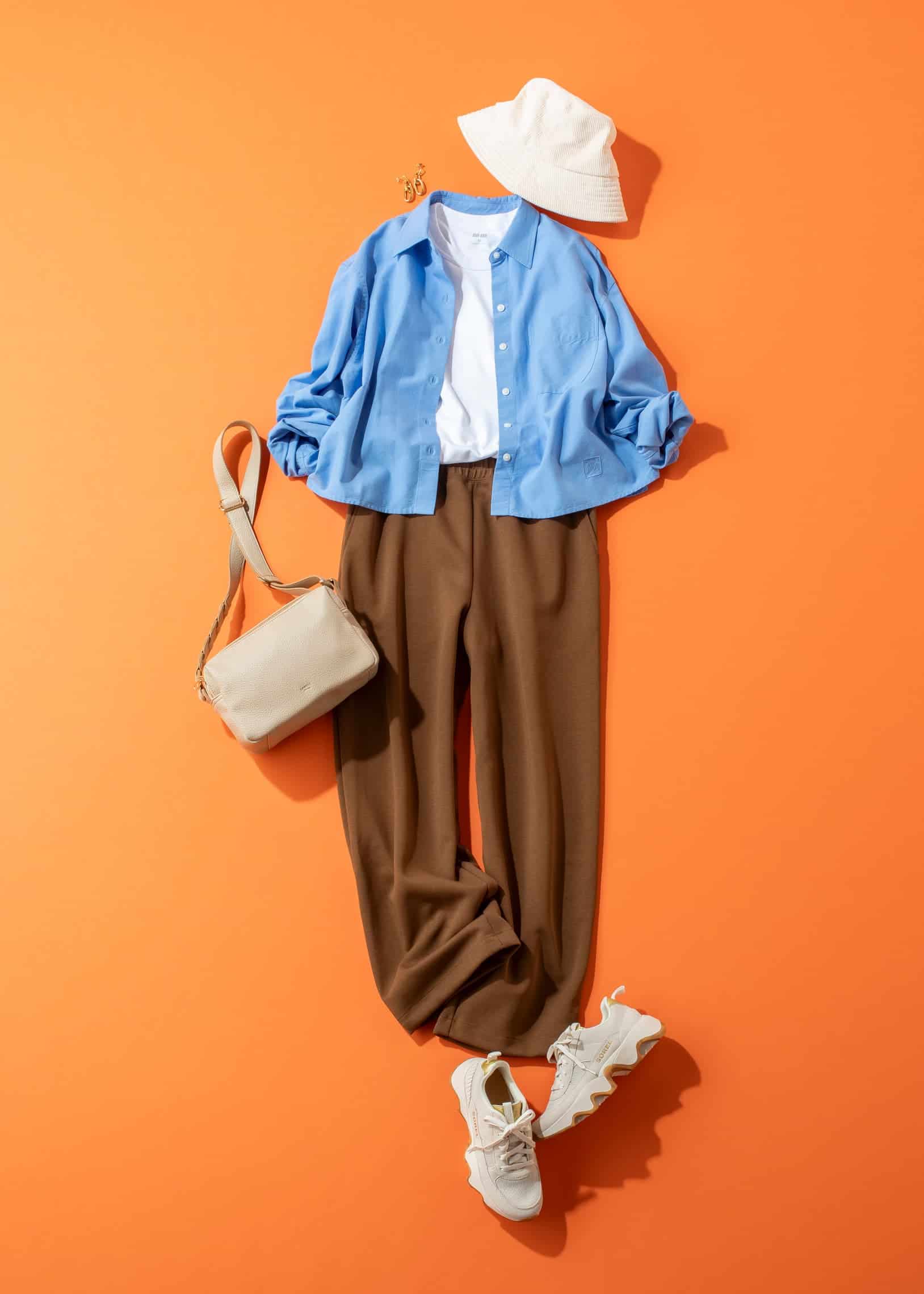シャツ¥3,990帽子¥1,990〈ともにUNIQLO〉Tシャツ¥1,500〈Uniqlo U〉パンツ(メンズ)¥3,990〈UNIQLO : C〉(すべてUNIQLO)バッグ¥11,000(ロウェル シングス/アバハウスインターナショナル オンラインストア)靴¥19,800(ソレル/コロンビアスポーツウェアジャパン)ピアス¥8,800(ワンエーアールバイウノアエレ/ウノアエレ ジャパン)