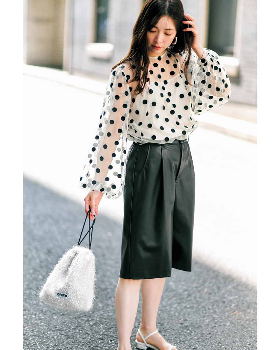 ポルカドットのシアーブラウスと無地のキャミソールのインナーがセットに。ふんわりシルエットとドット柄が洗練されたモードを演出します。デニムやハーフパンツなどカジュアルボトムスを合わせれば甘ニッシュコーデが完成。