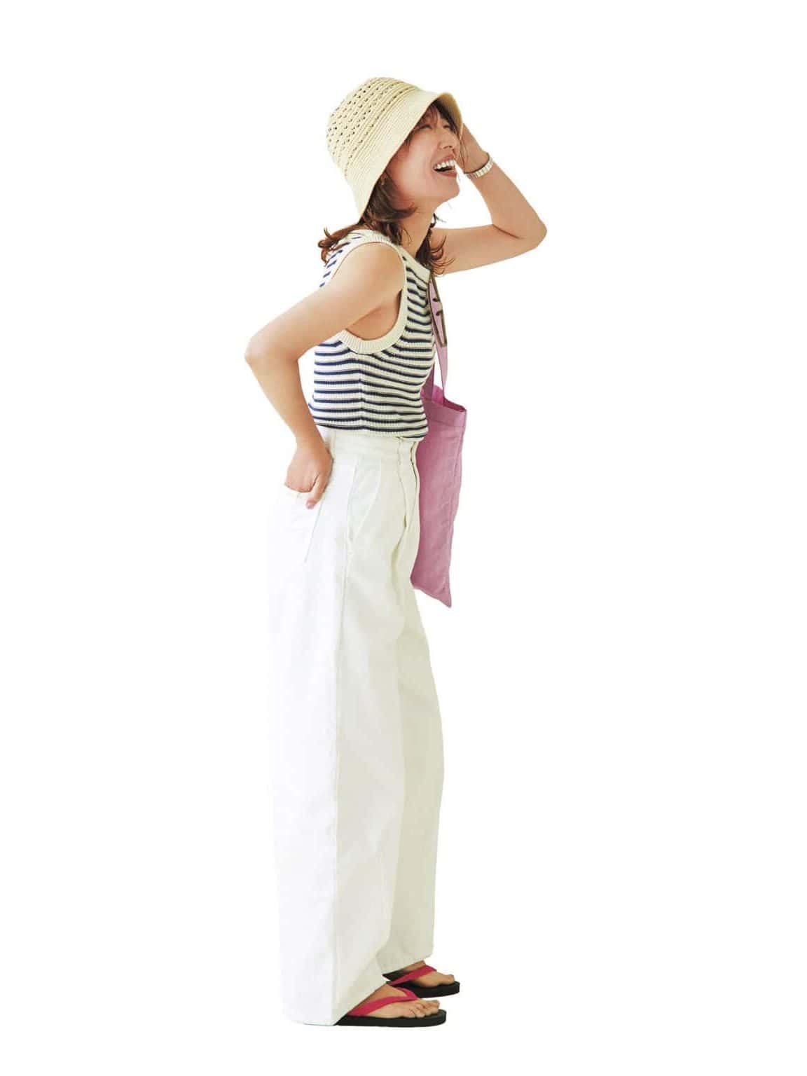 ニット¥1,290帽子¥1,990(ともにGU)パンツ¥10,450(ノミネ/アバハウスインターナショナル オンラインストア)バッグ¥4,950(ル タロン/ル タロン 有楽町マルイ店)サンダル¥4,950(SEA/エスストア)サングラス¥1,990(ユニクロ)