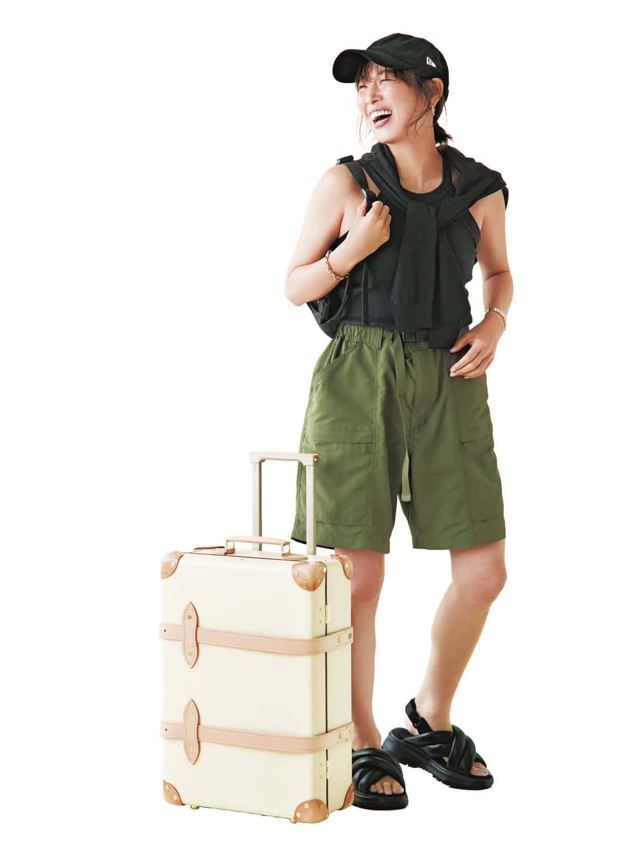 タンクトップ¥2,290カーディガン¥2,990ショートパンツ(メンズ)¥2,990(すべてユニクロ)バッグ¥13,200(SEA/エスストア)サンダル¥2,990(GU)キャップ¥4,620(ニューエラ)ピアス¥46,200ブレスレット¥81,400(ともにヌゥ ユゥ/アイネックス)トランク/本人私物