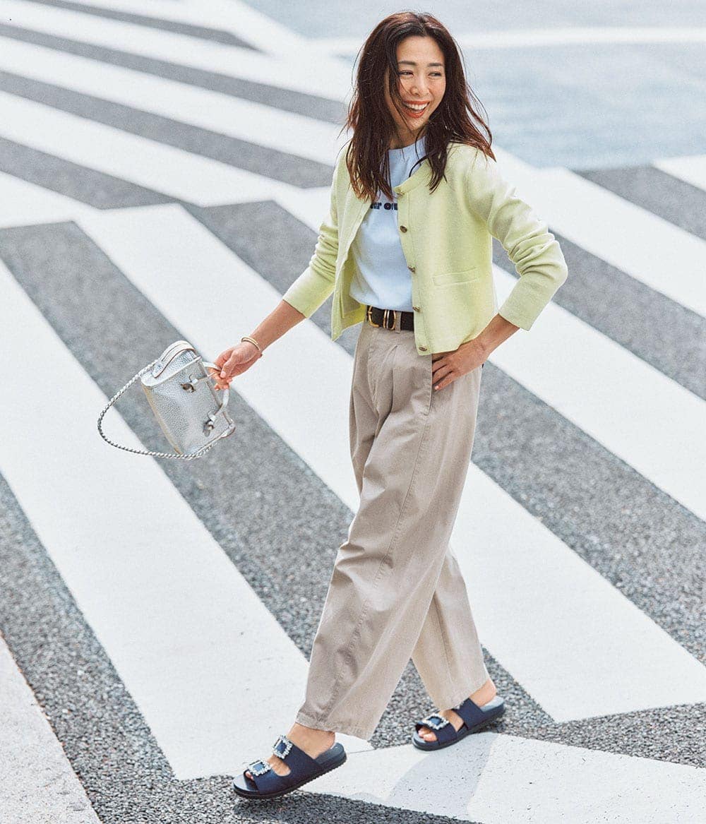 シューズ¥8,990(ザラ)Tシャツ¥9,350(アカサム/シップス)カーディガン¥2,990※一部店舗のみで販売(ユニクロ)パンツ¥17,600(カデュネ)バッグ¥14,300(アドカラム/アンソロジー)ピアス¥17,600(ココシュニック オンキッチュ/ココシュニック)ブレスレット¥12,100(サローネ サーティ/フォーティーン ショールーム)
