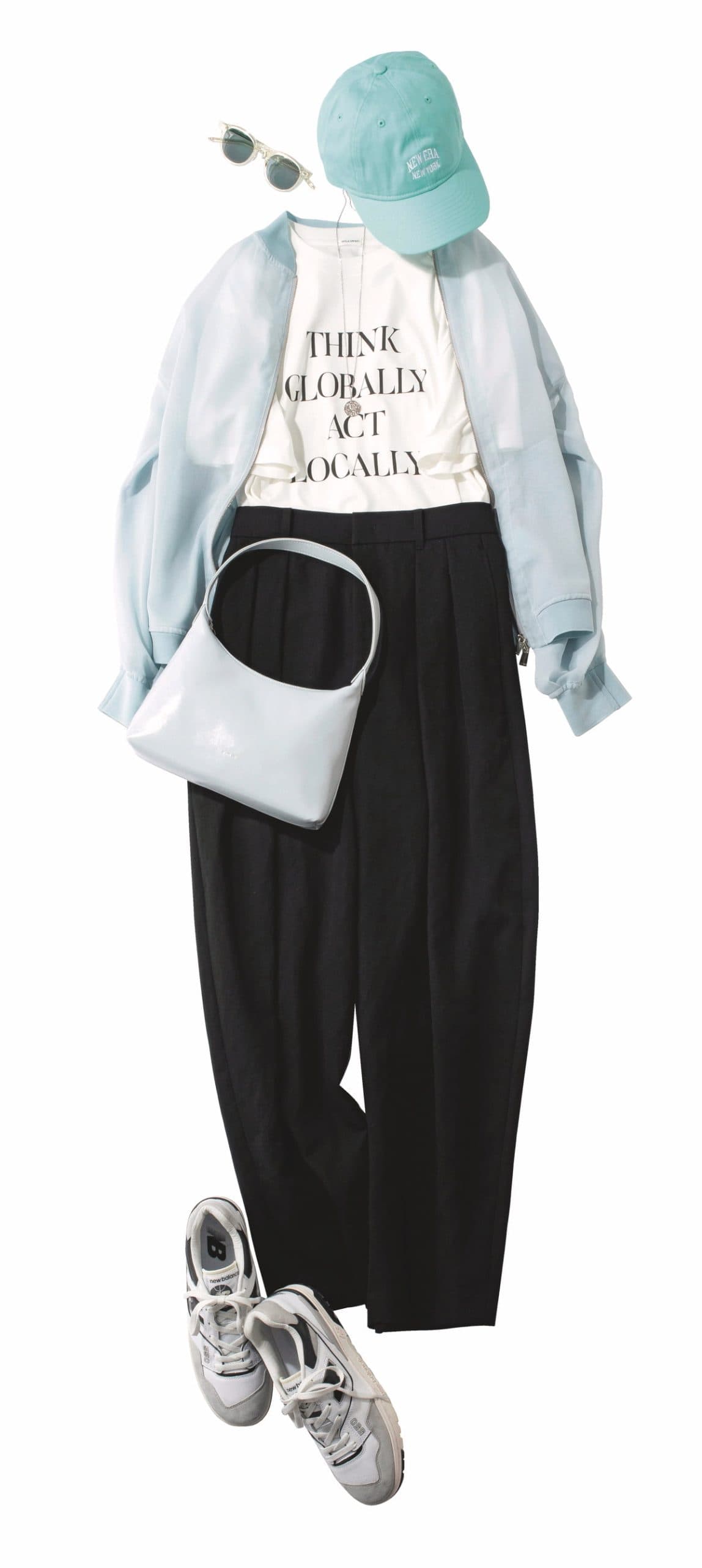 白T×黒パンツの定番ワンツーに、透け感のあるミントブルーを羽織って爽やかな印象に!カーデ感覚で着られる軽やかなシアー素材のブルゾンで、重たくなりがちな黒ボトムも涼しげに仕上がります。同色トーンのキャップやバッグをリンクさせれば、遊び心のあるカラー投入もすっきりまとまり、センスよく見えます。