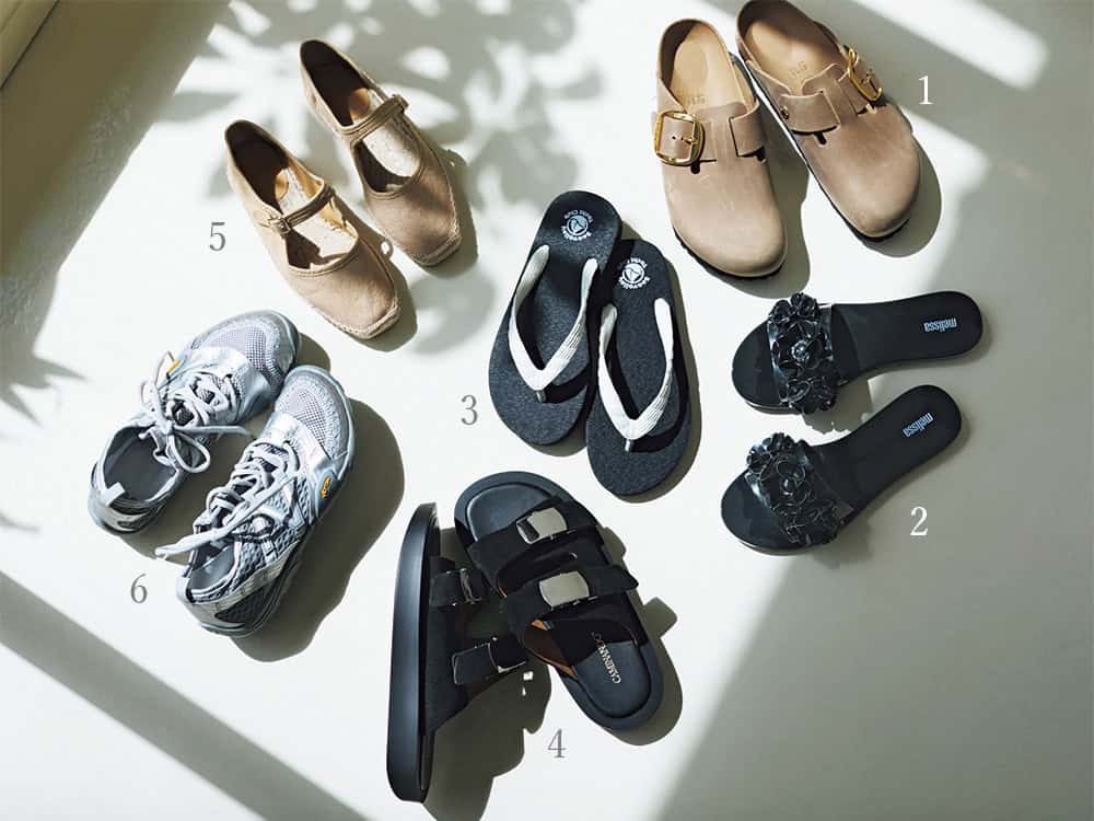 1.海外セレブ御用達サンダルが日本でも人気沸騰中。シューズ¥29,700(ビルケンシュトック/ビルケンシュトック・ジャパン カスタマーサービス)2.サンダル¥12,100(メリッサ/メリッサ シューズ ジャパン)3.ビーチサンダル¥4,950(シー/エスストア)4.シルバーバックルがスタイリッシュな一足。ダブルバックルサンダル¥29,150(カミナンド/グラビテート)5.シューズ¥29,700(カスタニエール/H3Oファッションビュロー)6.素足感覚の進化系スニーカー。スニーカー¥16,500(ニューバランス/ニューバランスジャパンお客様相談室)