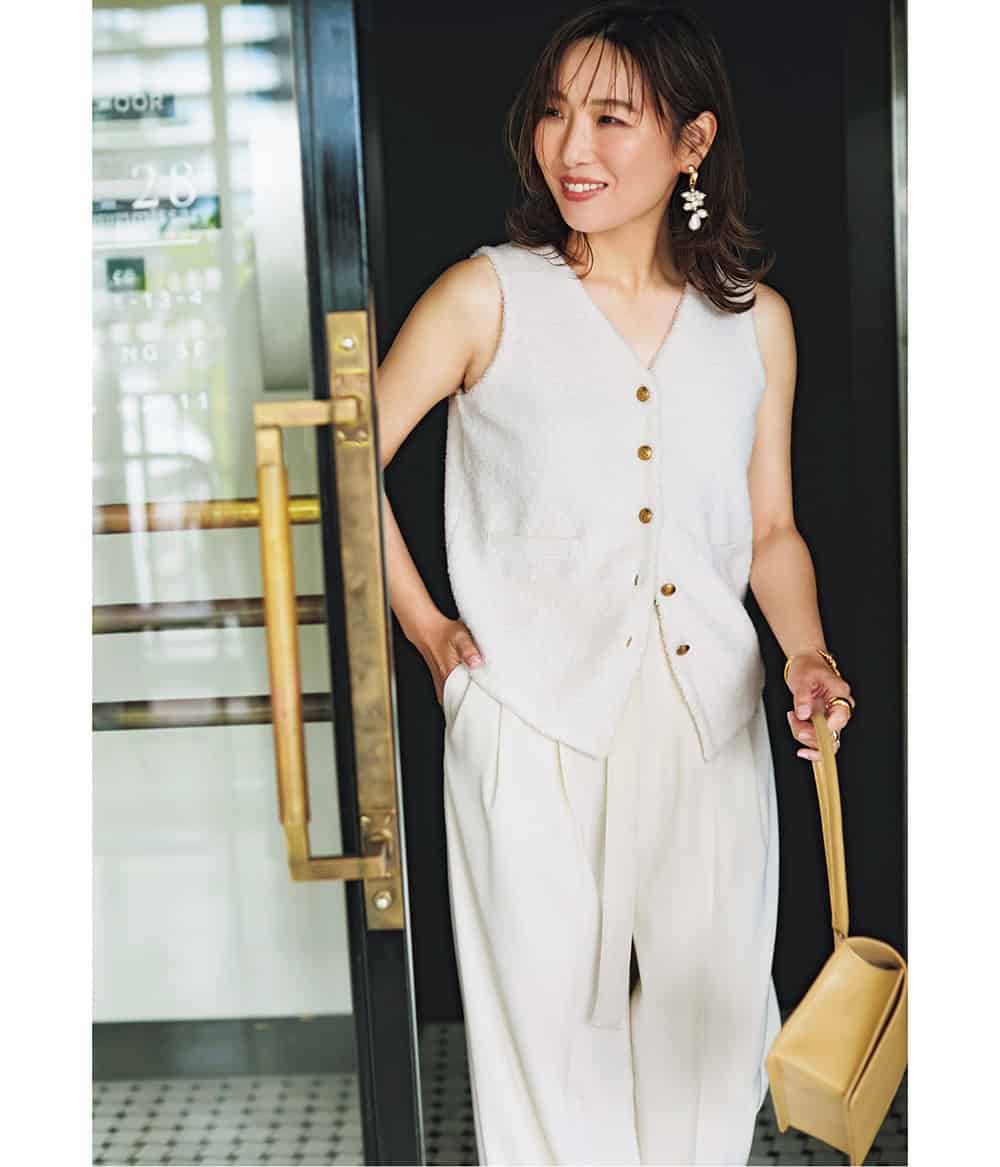 素材でも華やぐ肌触りのいいパイル地。ジレ¥29,700(サードマガジン)ベルト付きパンツ¥12,100(Mila Owen/Mila Owen ルミネ新宿2店)バッグ¥49,500(バケット バゲージ/アイネックス)ピアス¥44,000(マイケルミショー/ハウス オブ ロータス)ブレスレット¥83,600太リング¥38,500細リング¥30,800ピンキーリング¥27,500(すべてメゾンヴァジック/ヴァジックジャパン)