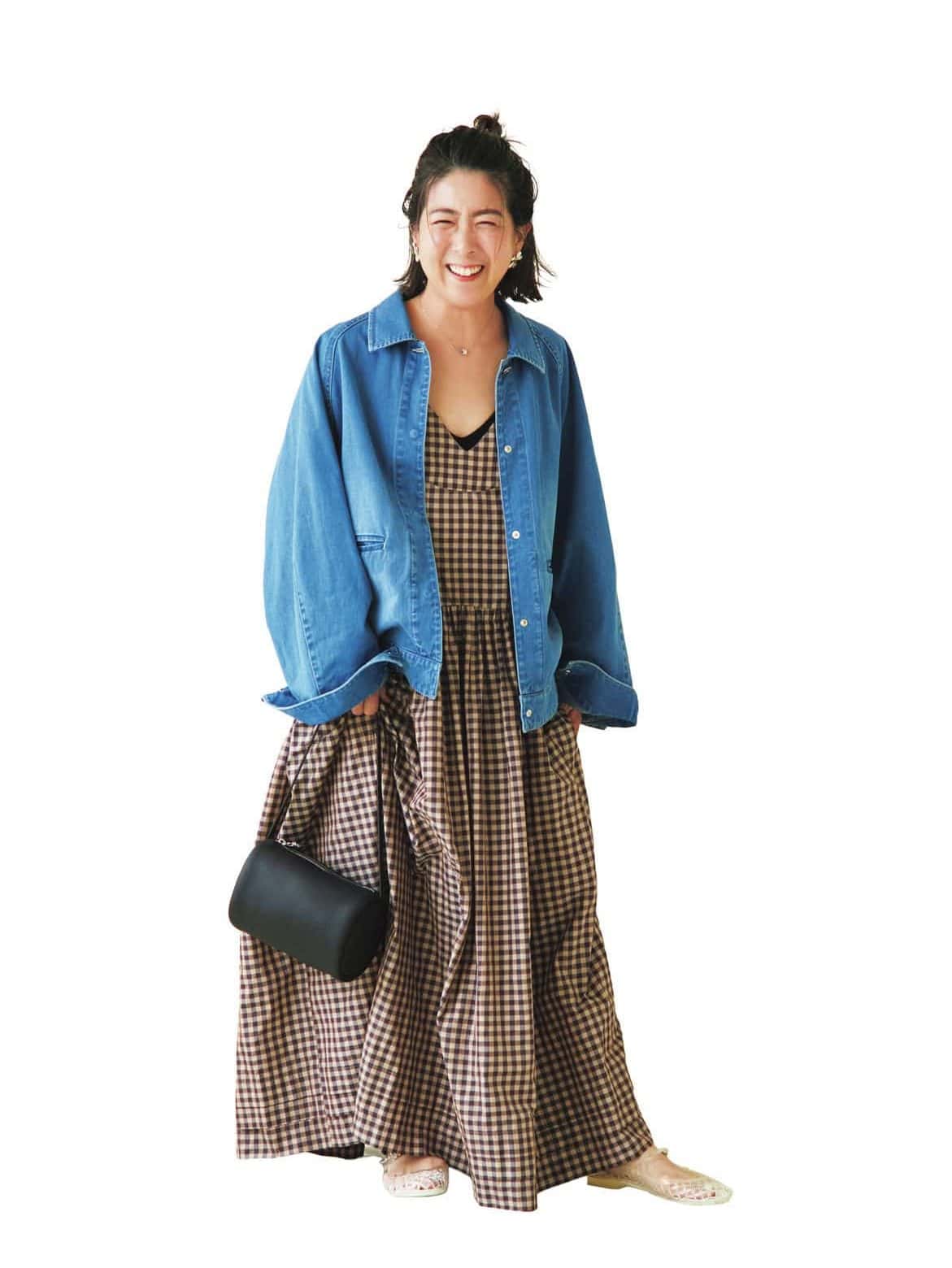 ブルゾン¥35,200(リエス)ワンピース¥24,200(メゾンスペシャル/メゾンスペシャル 青山店)バッグ¥33,000※ポップアップ限定(ヴァジック/ヴァジックジャパン)ピアス¥28,600(カラ・ユ/ショールーム ロイト)サンダル/本人私物