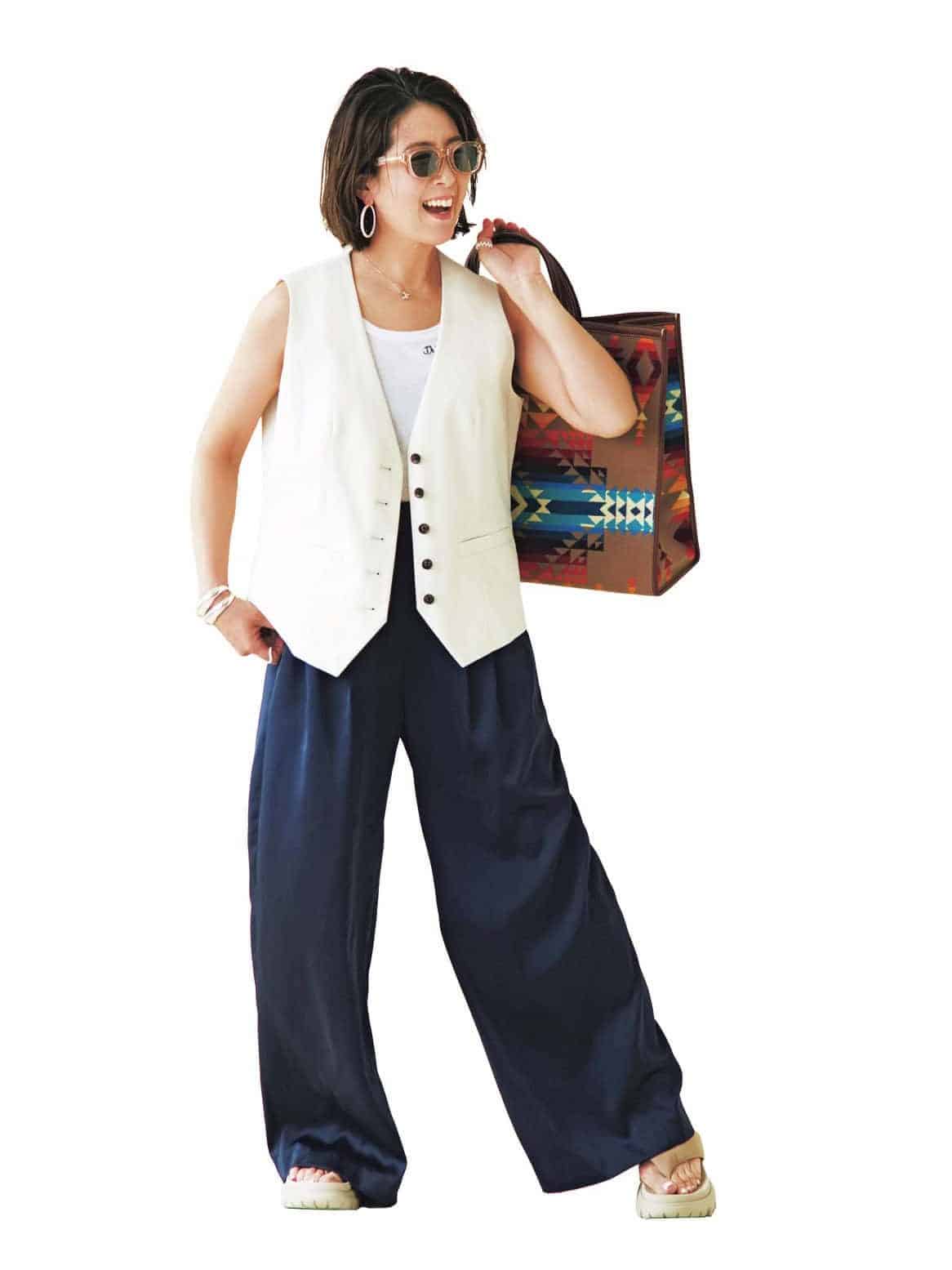 ジレ¥27,500(ザ シンゾーン/シンゾーン ルミネ有楽町店)タンクトップ¥7,700※グレーと2枚セット価格(サードマガジン×フルーツオブザルーム/サードマガジン)パンツ¥20,900(アルページュストーリー)バッグ¥84,700(ア ヴァケーション/ノーベルバ)サンダル¥15,400(シャカ/ブルームーンカンパニー)ピアス¥12,100(ウノアエレ/ウノアエレジャパン)リング¥14,300(ラムダ)バングル¥27,500(フィリップ オーディベール/マルティニーク ルミネ横浜)サングラス¥35,200(ブラン/ライト)