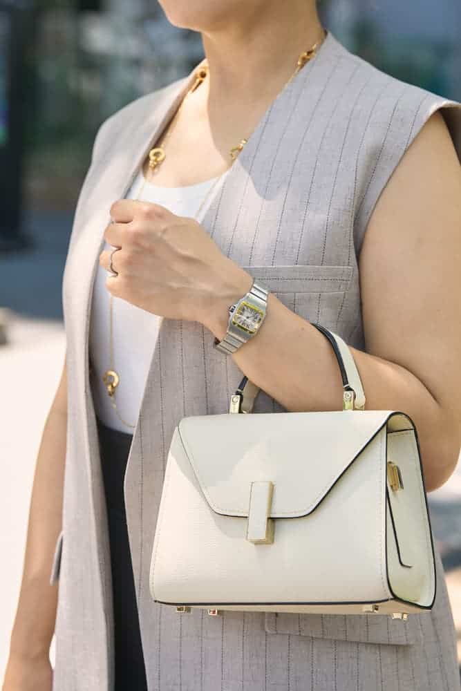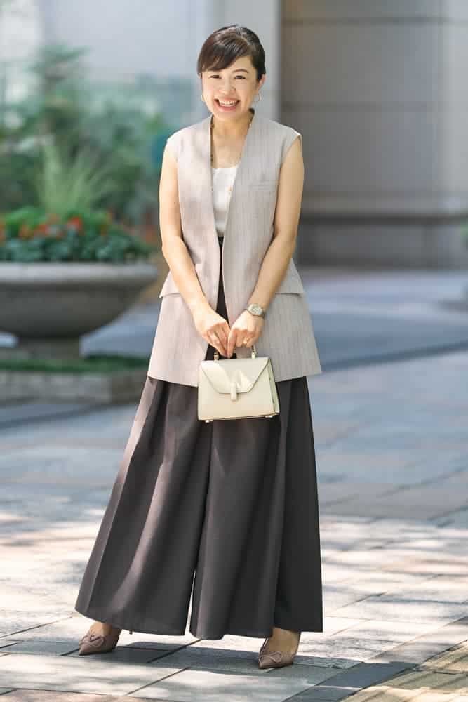 カジュアルからビジネスシーン、更には和装にも合い幅広く使えるところが気に入って購入しました。仕事でも使いやすいようにと黒のバッグばかり選びがちだったので、柔らかいイジィデの白に惹かれたのも購入の決め手でした。秋のはじまりは暑い日が続くので、仕事でも使えるストライプのジレをポイントに、お気に入りのTHE RERACSのスカート見えワイドパンツに、ジュエリーはゴールド合わせで大人らしく仕上げました。
