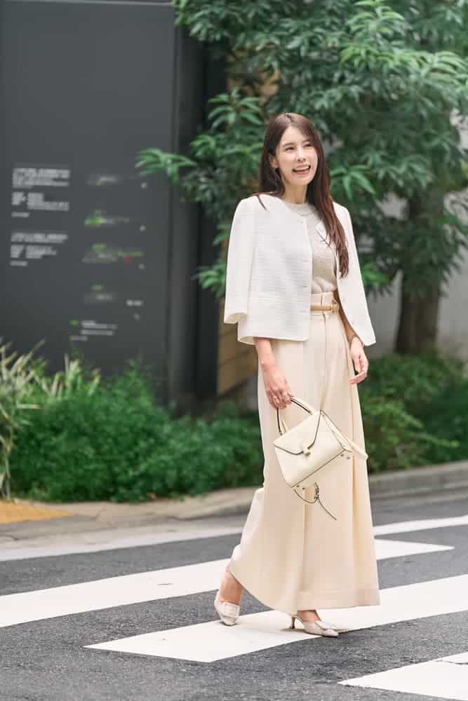 白いバッグが欲しいと思った時に、汚れに強いイジィデに決めました。持つだけで品を纏える形と、開閉しやすい金具も決め手のポイントでした。夫とランチデートへ行く時は、オールホワイトコーデで優しげをプラスして。寒暖差対策にもなるツィードのジャケットに、ゴールドラメのインナーがメリハリと大人の遊び心を。一目惚れ買いしたMANOLO BLAHNIKのレースパンプスに美脚効果の高いハイウエストパンツでスタイルアップも忘れません。