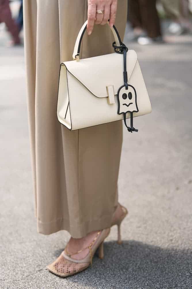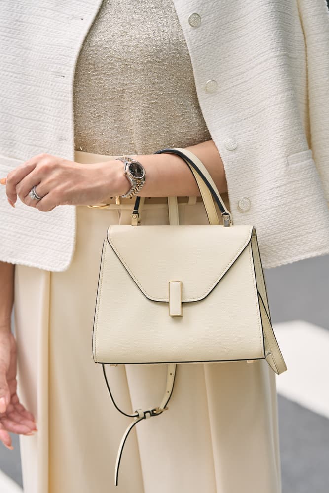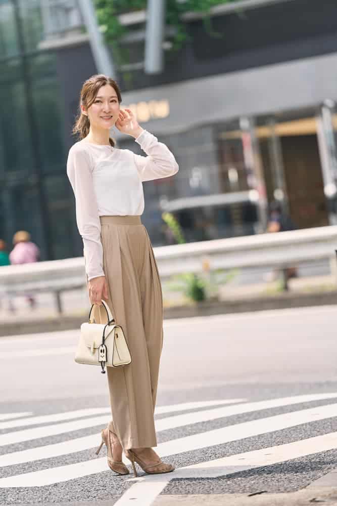 シンプルで上品なデザインのイジィデに一目惚れしました! 白いバッグは汚れが気になり挑戦できずにいましたが、イジィデの汚れや傷が付きづらい素材に購入を決意! ワンハンドルでフォーマルはもちろん、カジュアルにも合う万能さもお気に入りポイントです。同じくヴァレクストラで購入したチャームを付けて変化を楽しんでいます。一枚で着てもニュアンスの出るシアー素材のトップスにベージュのワイドパンツでシンプルにまとめました。夏から秋への中間期にピッタリなメッシュのパンプスで抜け感を出します。
