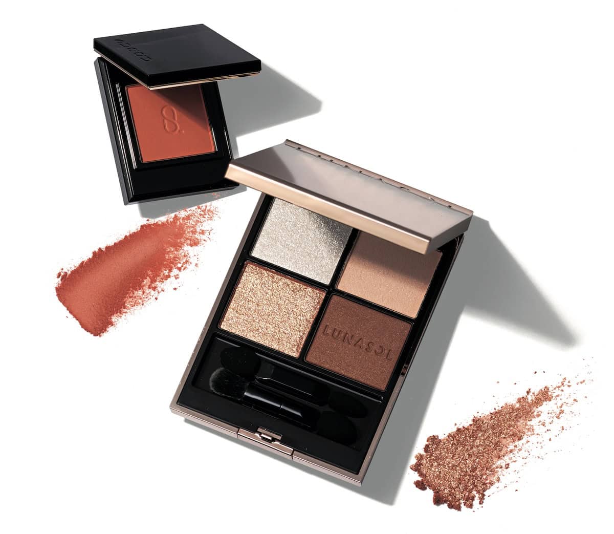 〈右〉洗練されたベージュパレット。ルナソル アイカラーレーションN 15 ¥7700(カネボウ化粧品) 〈左〉アプリコットオレンジ。SUQQU モノ ルック アイズ M-03 ¥4,290(SUQQU)