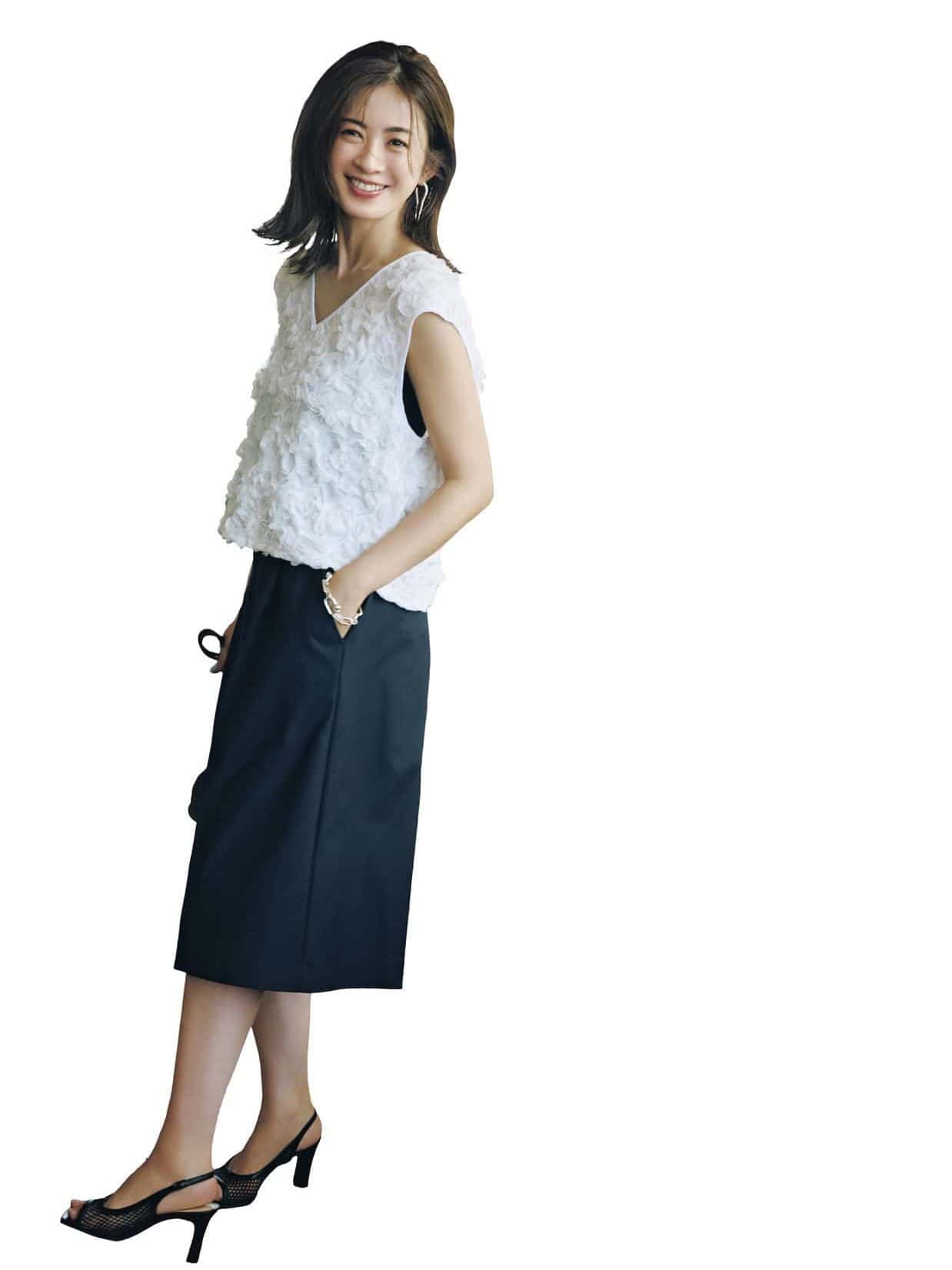 ブラウス¥27,000(シーニュ)パンツ¥88,000(アドーア)バッグ¥72,600(ピエール アルディ/ピエール アルディ 東京)ピアス¥8,800(イットアトリエ/フォーティーン ショールーム)リング[右手人さし指]¥27,720(フェルセラ/ズットホリック)リング[右手薬指]¥2,640(アネモネ/サンポークリエイト)