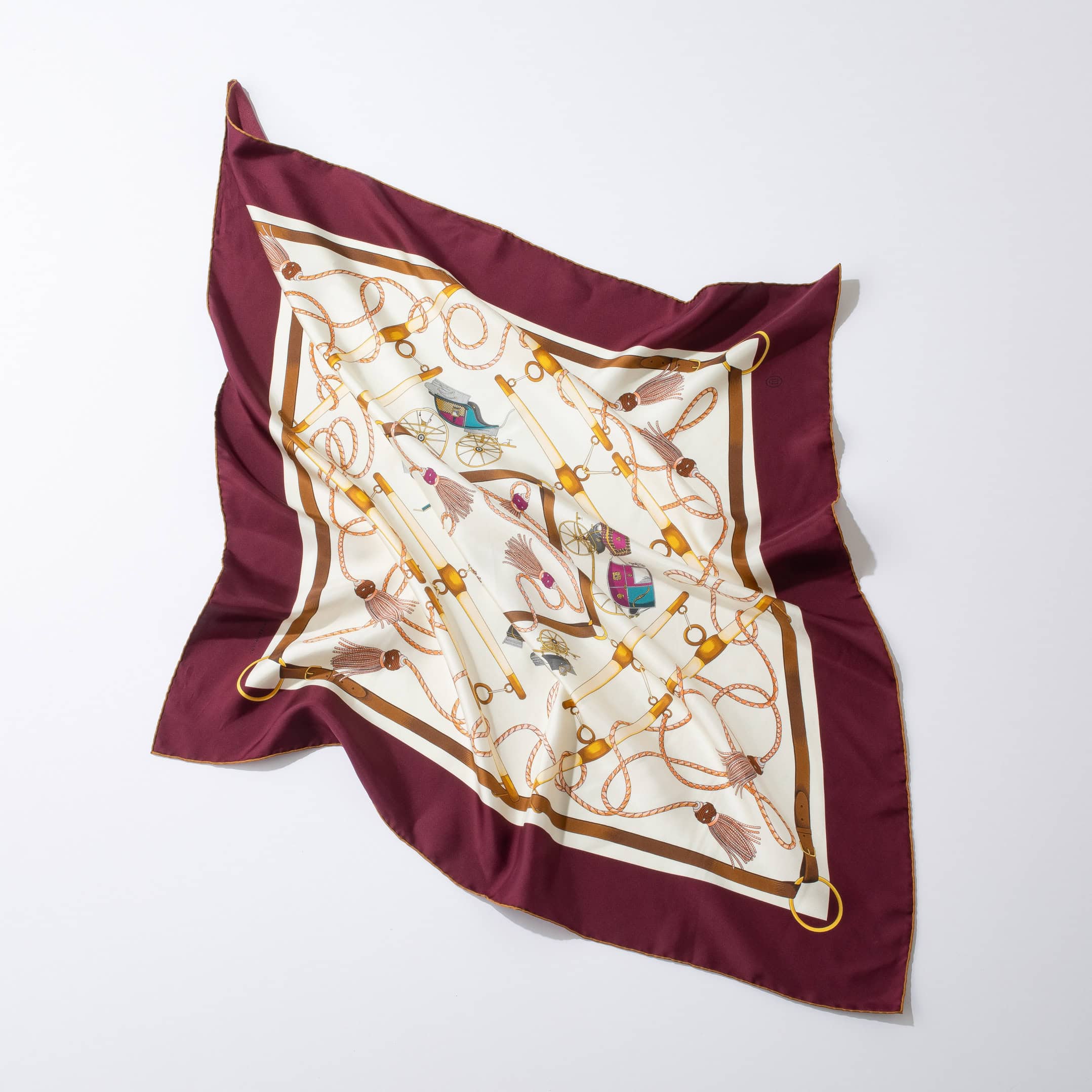 深みのあるボルドーに、タッセルモチーフが描かれた一枚は、まるで装いに詩情を添えるアートピース。艶やかなシルクの光沢が、秋風にふわりと揺れ、知的で華やかな印象を引き立てます。コーディネートにエスプリを効かせる、大人のための逸品。