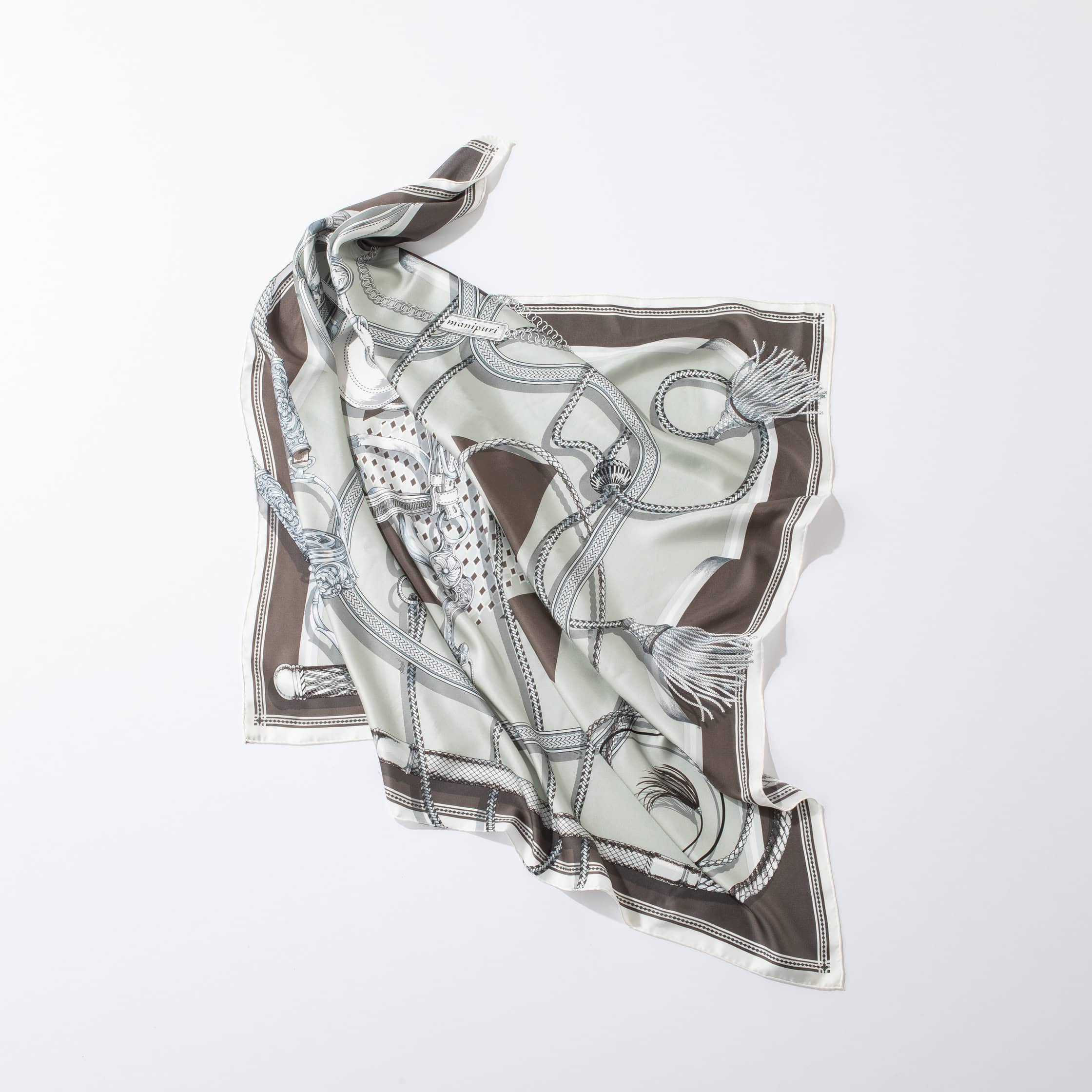 馬具から着想を得たアートプリントが、グレーのニュアンスカラーでシックに昇華。滑らかなシルク素材が放つ自然な光沢感が、首元にさりげないラグジュアリーを添えます。タイムレスに愛せる一枚は、スタイリングの主役にも、引き立て役にもなる万能アイテム。