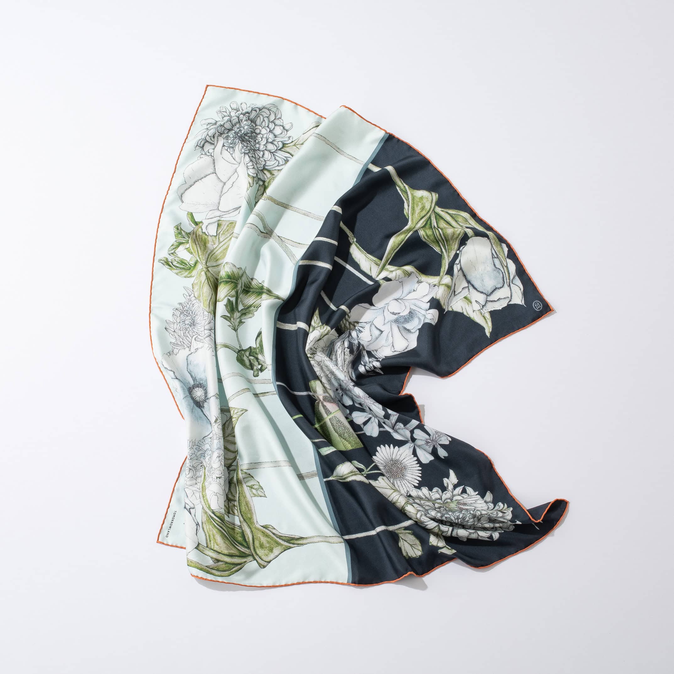繊細なフラワーモチーフを、バイカラーに乗せたデザインは、秋の空気と絶妙に呼応し、クラシックなムードを漂わせます。シルクのやわらかな肌ざわりと上品な光沢が、ジャケットやニットの隙間から静かな存在感を放ち、装いにそっと華を添える一枚。