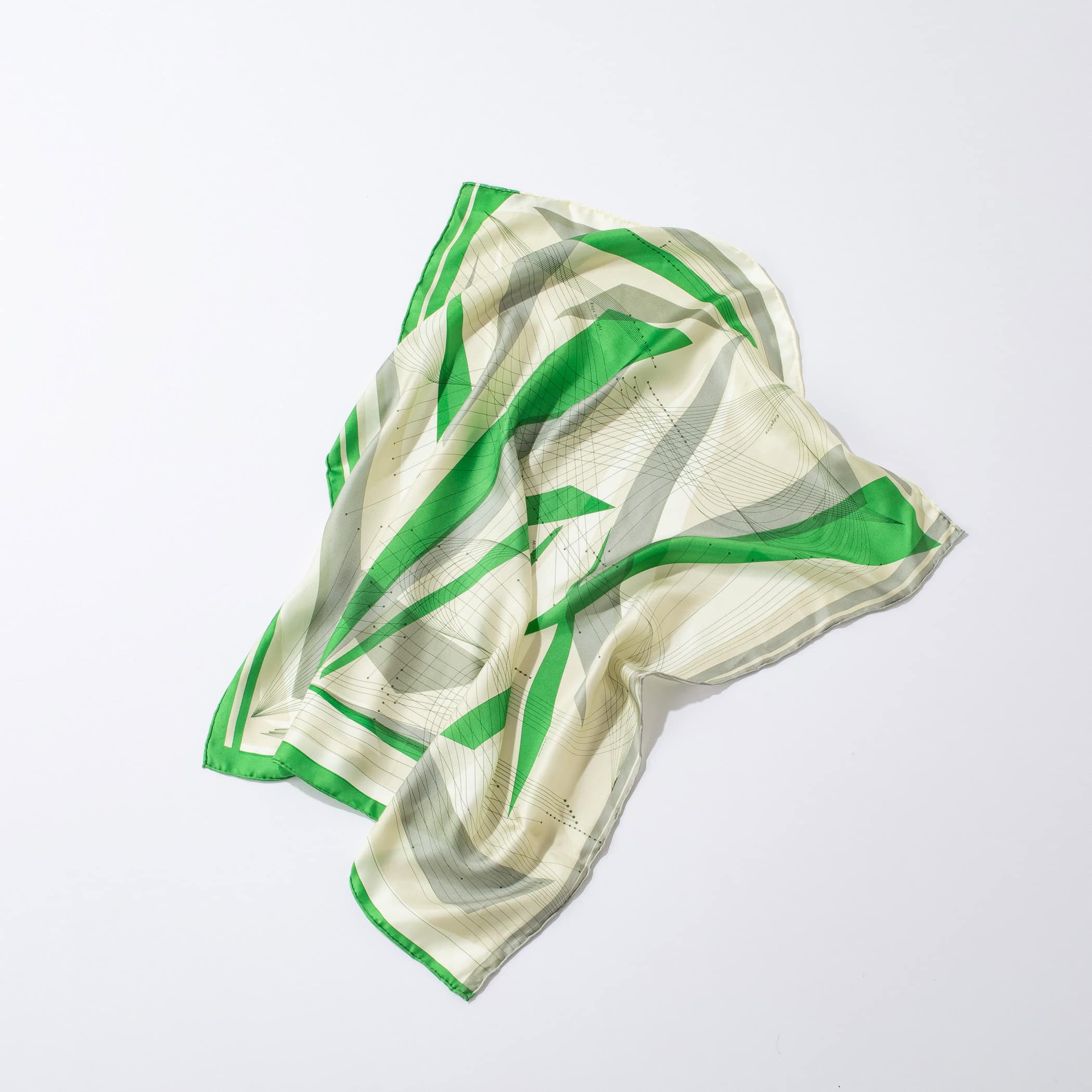 シルクのしなやかな質感が肌に心地よく寄り添い、鮮やかなグリーンがシンプルな装いに程よいスパイスを効かせます。65cmの絶妙なサイズ感で、バッグに結んでも、首元に取り入れても、洗練された印象に。季節を問わず、スタイリングに奥行きを添えます。