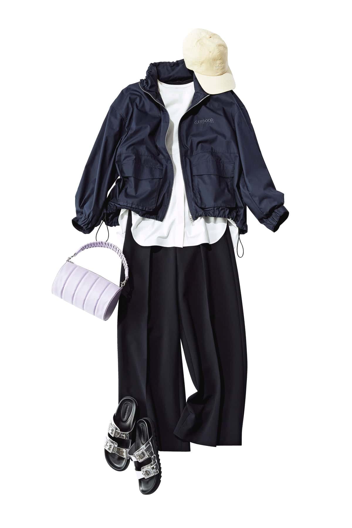 ブルゾン[ZERO-TEXⓇ/イージーケア]¥15,994(アウトドアプロダクツ × フリークス ストア/フリークス ストア渋谷)ノースリーブトップス[ソロテックスⓇ/速乾性・シワになりにくい・軽量]¥22,000(LE PHIL/LE PHIL NEWoMan 新宿店)パンツ[撥水・マシンウォッシャブル]¥28,600(アンクレイヴ)バッグ¥42,900(リンク)サンダル¥9,900(チャールズ&キース/チャールズ&キース ジャパン)キャップ[チャンピオン別注]¥3,850(ロペピクニック パサージュ)