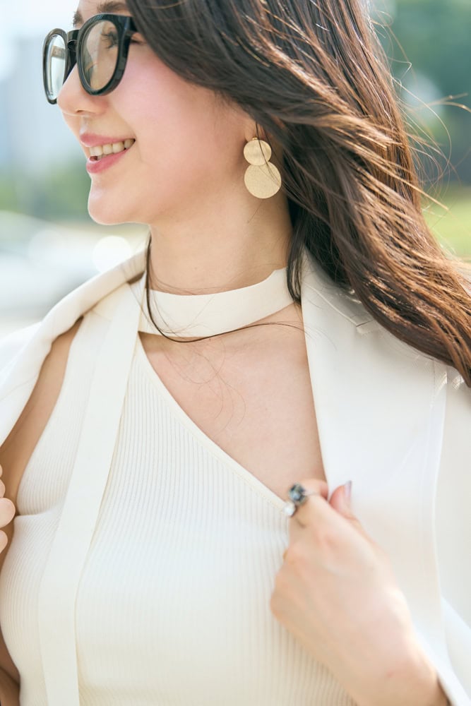 女性らしい肌見せトップスには、ジャケット肩がけで晩夏を表現。ショーパンはベルトを添えることで、ワントーンコーデのアクセントを。黒縁メガネがコンサバへの傾きを回避し、より一層マニッシュな印象を引き立てます。