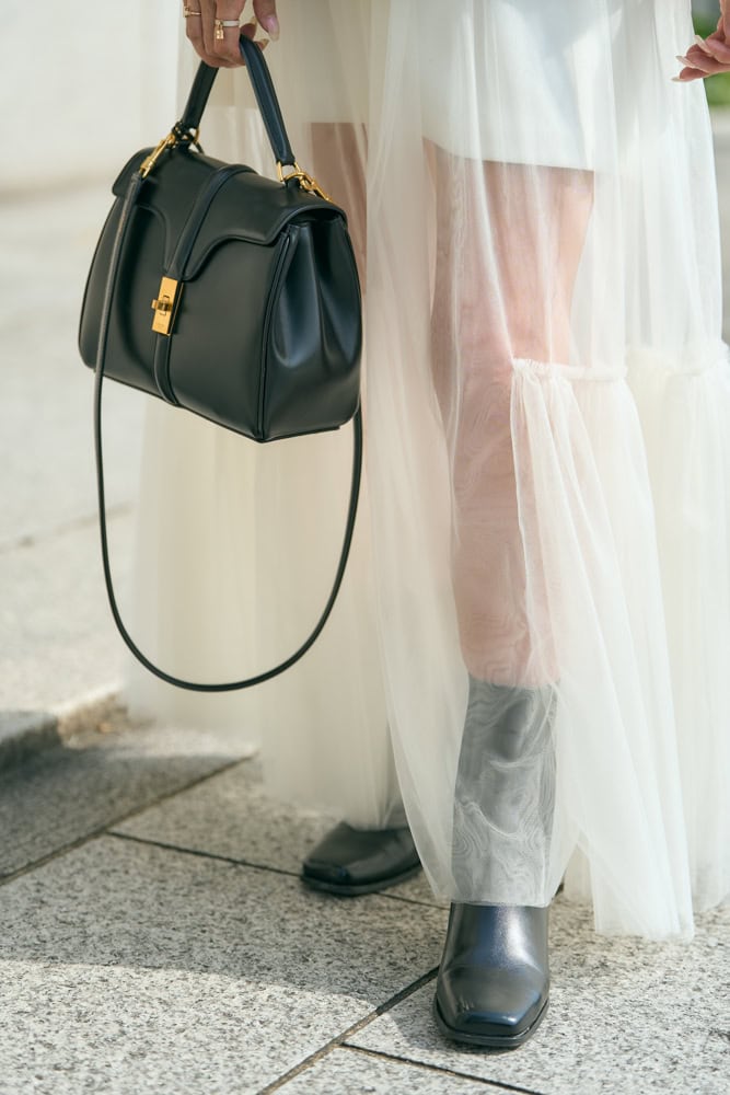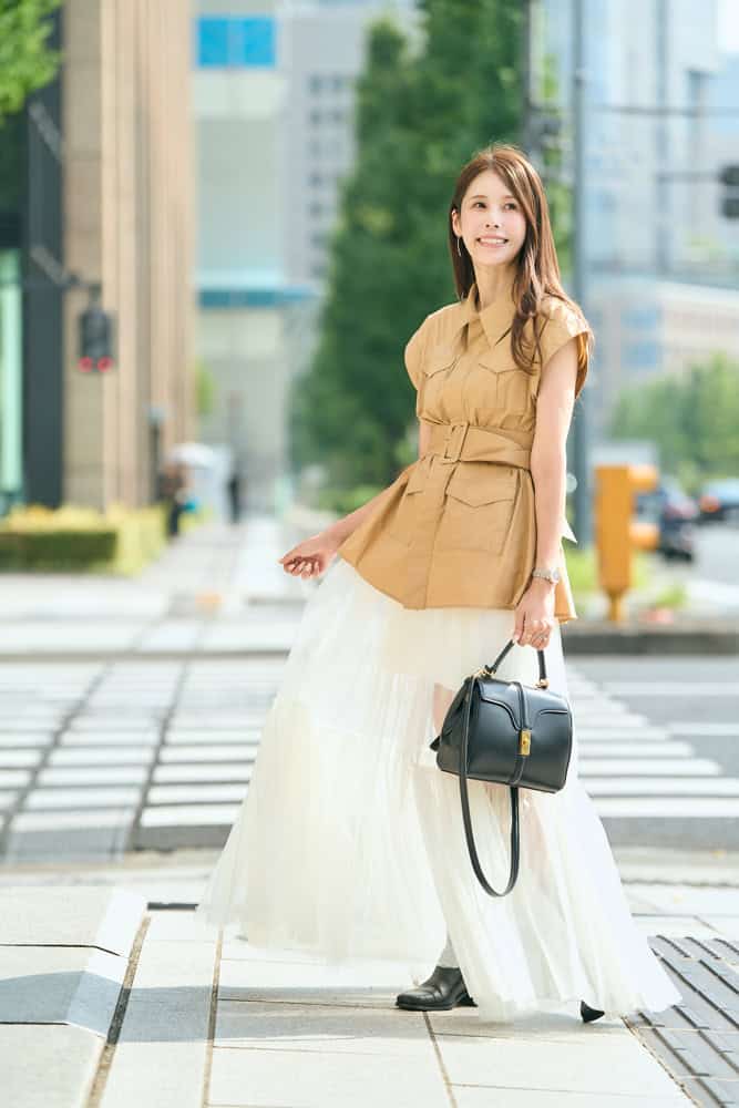 まだ猛暑な9月、引き続きシースルー素材を履くときには、ウエストマークしたマニッシュジレやゴツめブーツを添えることで大胆な脚だしも、ちょいモードに晩夏ムードを高めます。