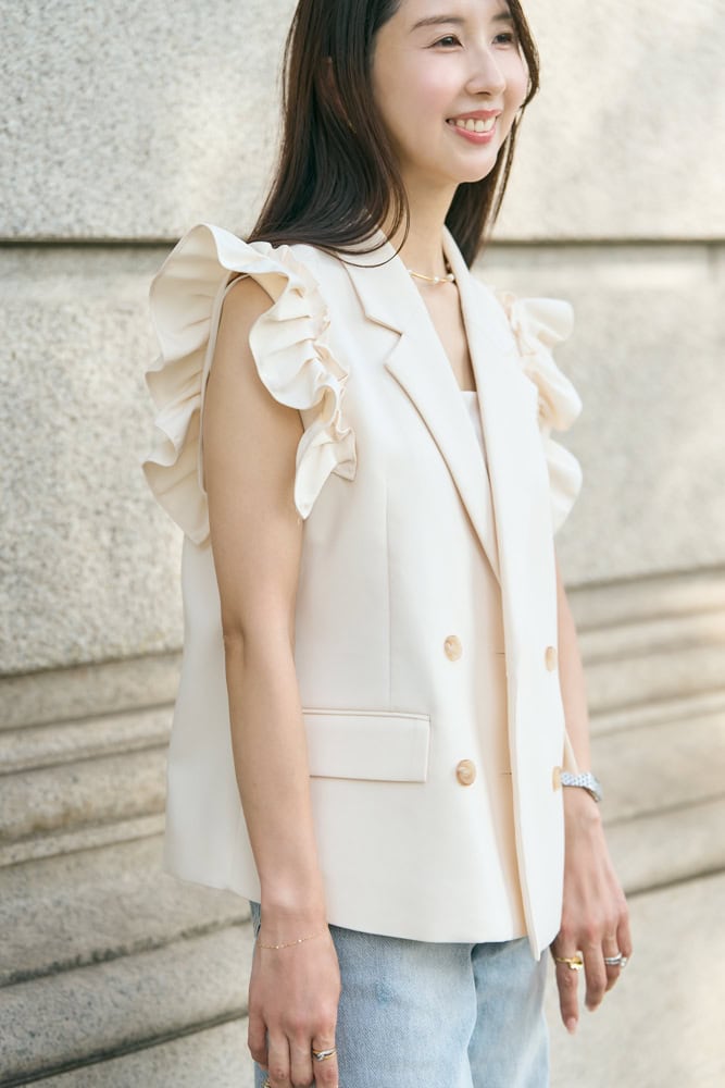 キッズとの日々で欠かせないデニムだって、さりげないフリルのジレを纏えば甘ニッシュが即叶う! デコラティブな袖デザインを顔まわりに添えることで、夕方のお迎え時の疲労感すら払拭させられます。