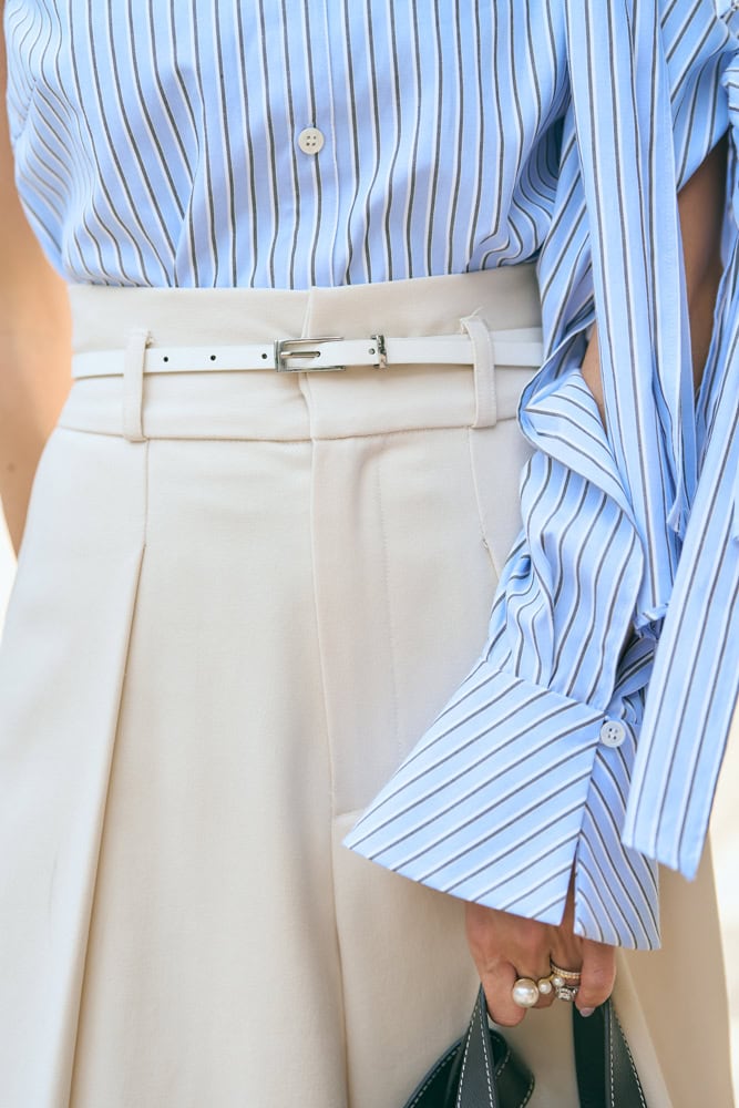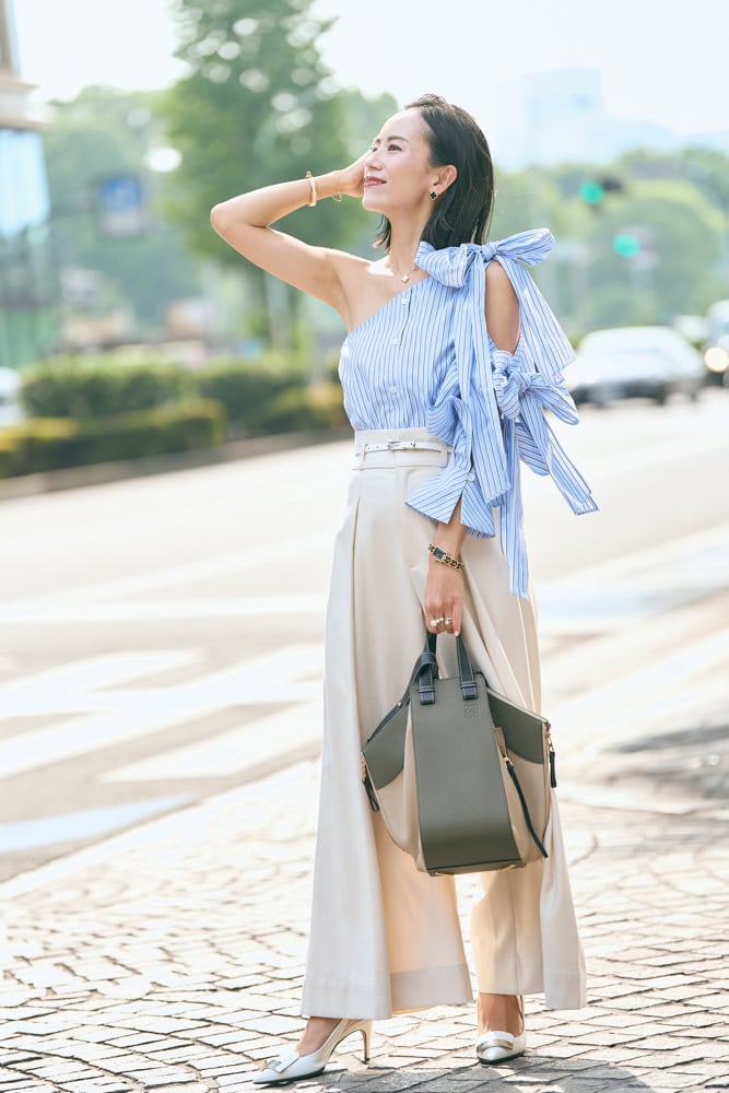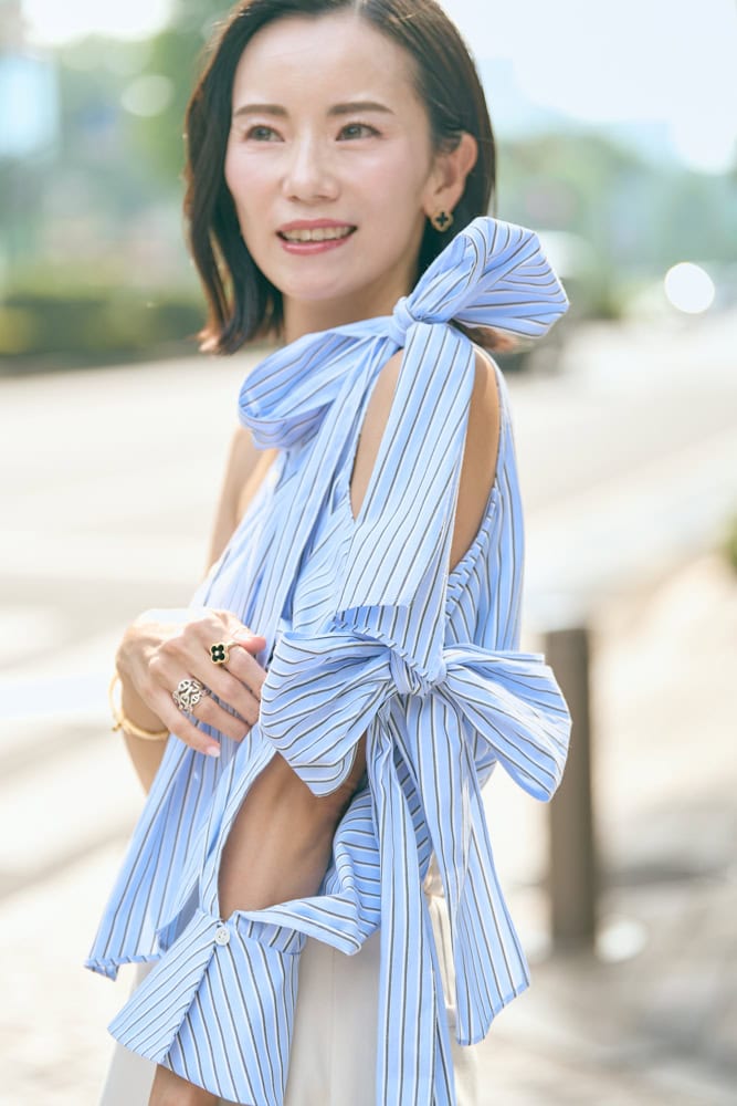 揺れるビッグリボンとブルーストライプのワンショルがアイキャッチーなシャツ。「それどこの?」から広がる会話が、落ち合って早々のトーキングポイントに。凝縮された甘さをトップスに持ってきた際は、ボトムスや小物のカラーを統一して微糖に調整。