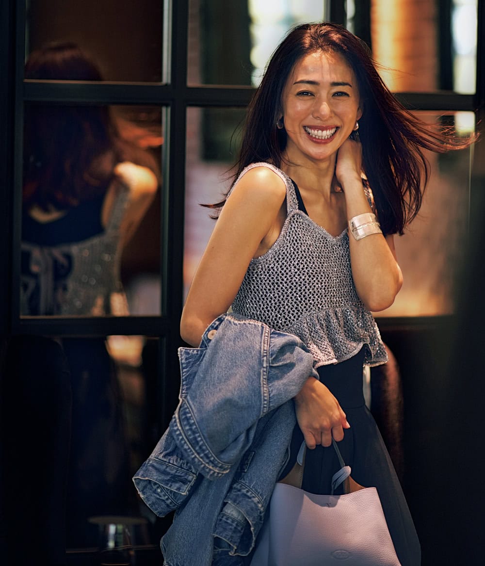 シルバーキャミソール¥14,960(FRAY I.D/FRAY I.D ルミネ新宿2店)手に持ったデニムジャケット¥49,500(ニードバイヘリテージ/ゲストリスト)タンクトップ¥13,200(ティッカ)パンツ¥24,200(メゾンスペシャル/メゾンスペシャル 青山店)バッグ¥185,900(トッズ/トッズ・ジャパン)ピアス¥24,640〈バルブス〉バングル¥29,700〈アドラル〉(ともにZUTTOHOLIC)リング¥33,000(プラウ)