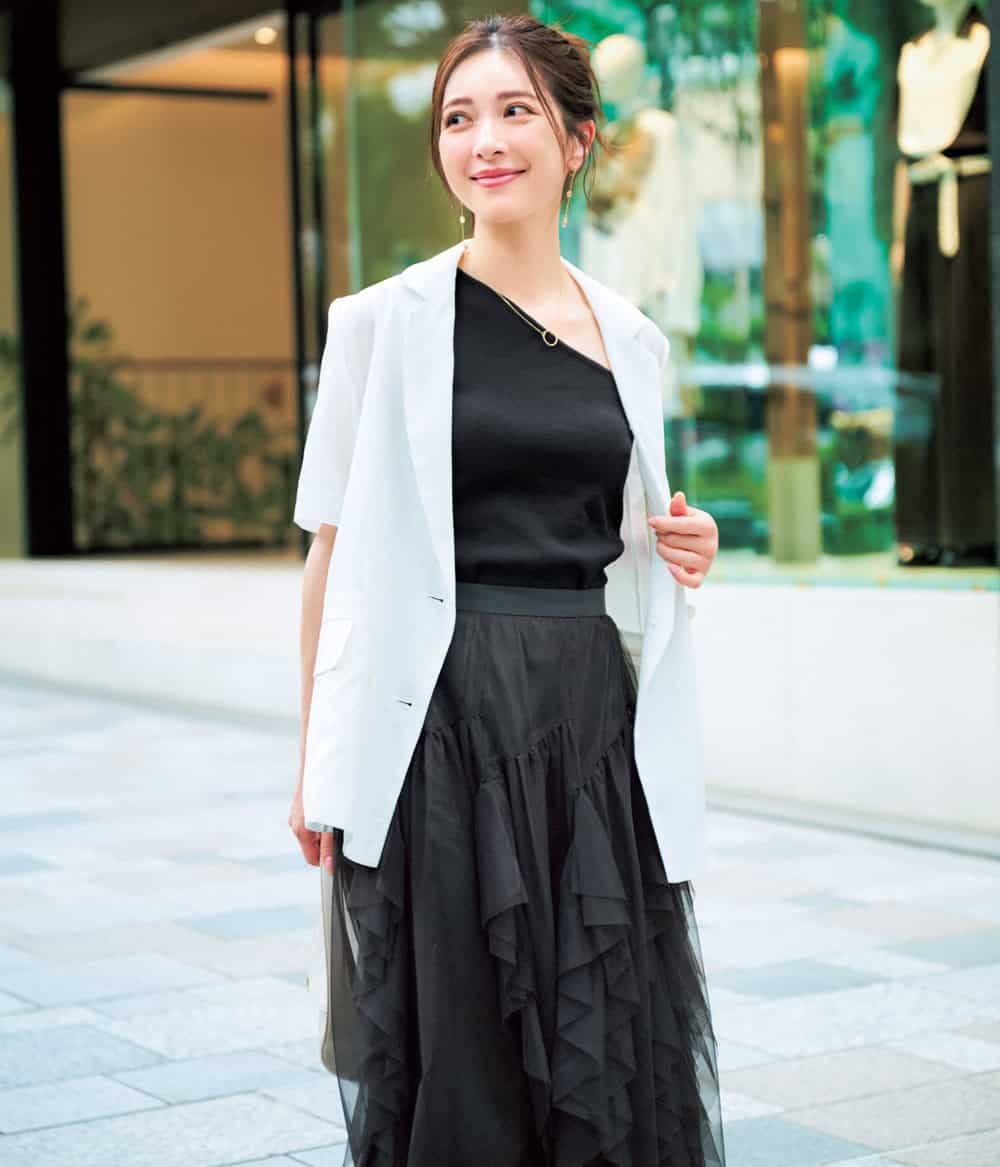 カットソー¥8,800(セブンドット)ジャケット¥23,100(マイストラーダ)スカート¥24,200(アルページュストーリー)バッグ¥72,900(カフネ/カフネ カスタマーサポートセンター)イヤリング¥9,900(イットアトリエ/フォーティーン ショールーム)ネックレス¥143,000(ウノアエレ/ウノアエレ ジャパン)