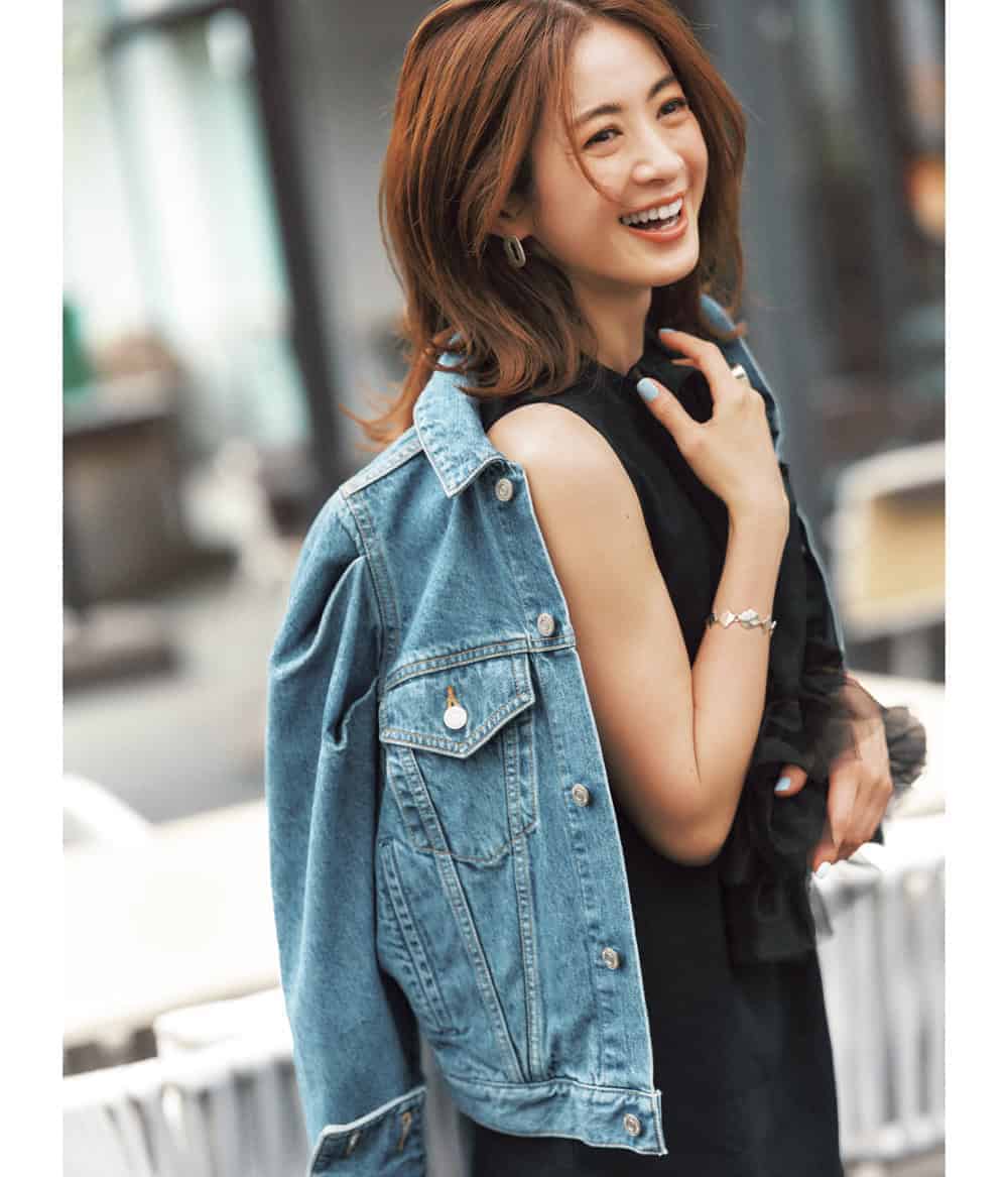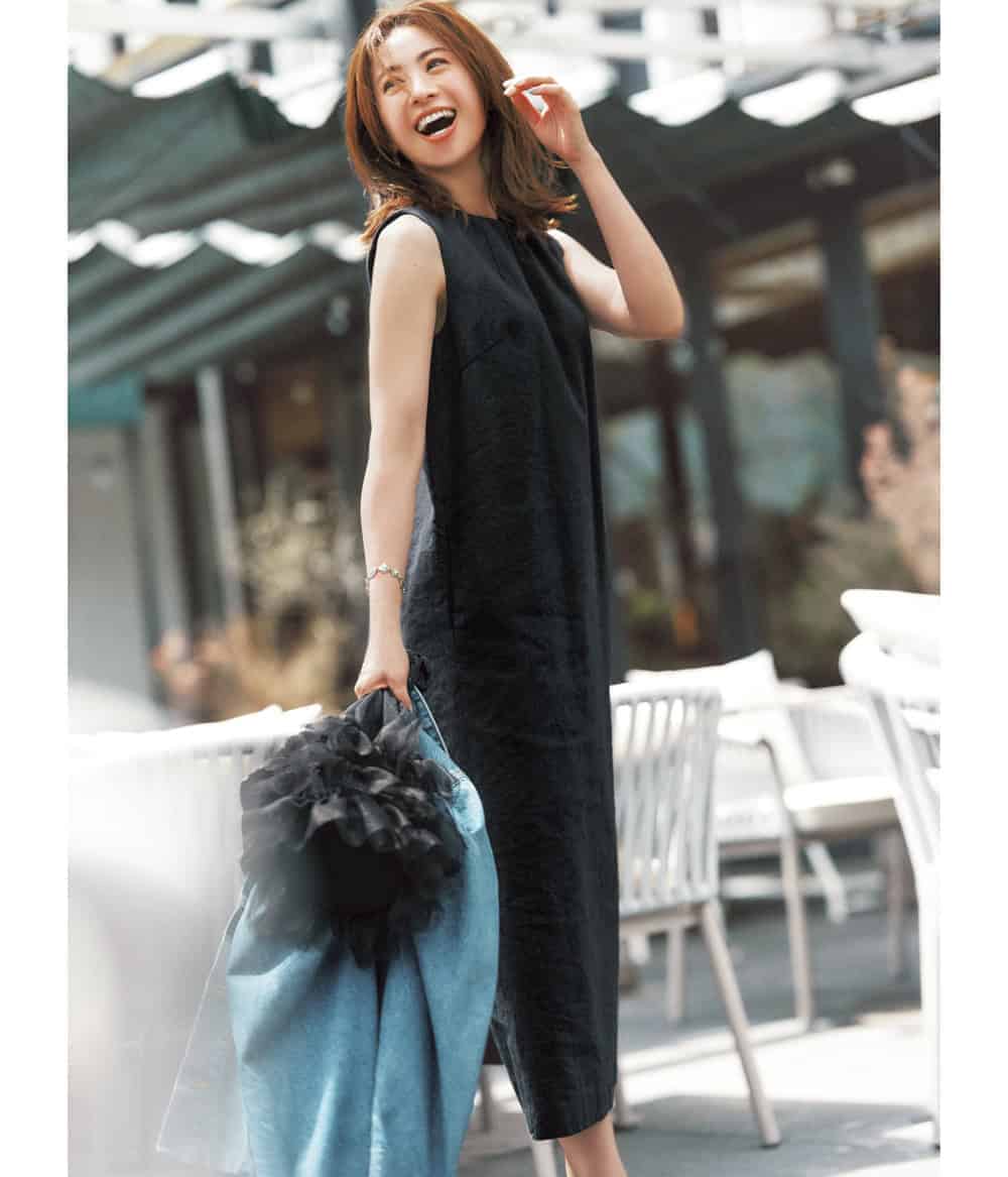 着心地もコーデも楽ちんな、シンプルな黒ノースリワンピース。夏はエフォートレスに着こなしたけれど、白の半袖ジャケットをさらりと羽織れば、モード感が加わって都会仕様の着こなしにアップデート。黒×白のクリーンな配色で、残暑の9月も涼やかかつきちんと感ある大人スタイルが完成。