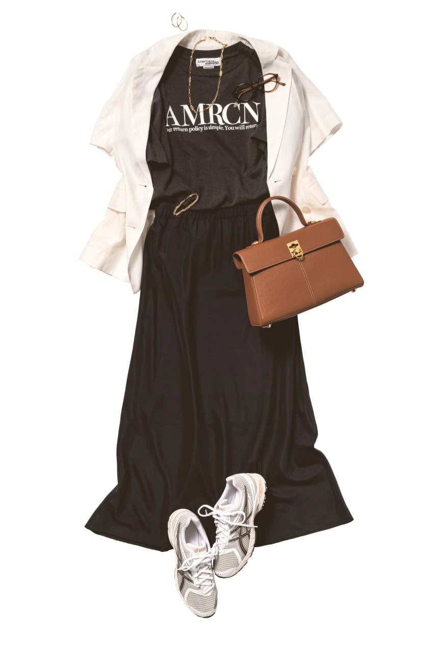 ジャケット¥23,100(マイストラーダ)Tシャツ¥13,200(アメリカーナ×ジーンズ ファクトリー/ジーンズ ファクトリー 卸団地本店)スカート¥18,700(アンクレイヴ/アンクレイヴ〈オンワード樫山〉)バッグ¥107,100(カフネ/カフネ カスタマーサポートセンター)シューズ¥15,400(アシックス/アシックスジャパン カスタマーサポート部)メガネ¥35,200(ブラン/ライト)ピアス¥132,000(ウノアエレ/ウノアエレ ジャパン)ネックレス¥20,900(ココシュニック オンキッチュ/ココシュニック)ブレスレット¥57,200(O-KI/ロードス)