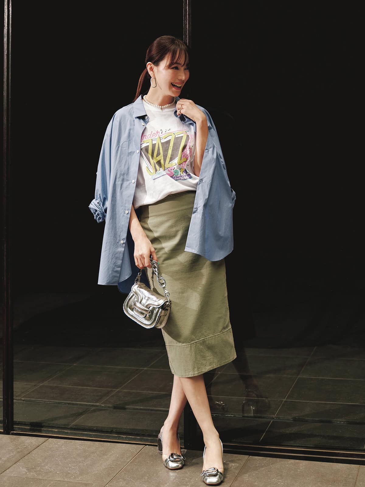 挑戦したいとは思いつつ、大人になるとなかなか難しいロックT。タイトスカートで女っぽさを盛り込みつつ、仕上げにはシャツを羽織ってキレイめになじませるのが成功への近道。それぞれが魅力を引き出し合った、大人のカジュアルに。