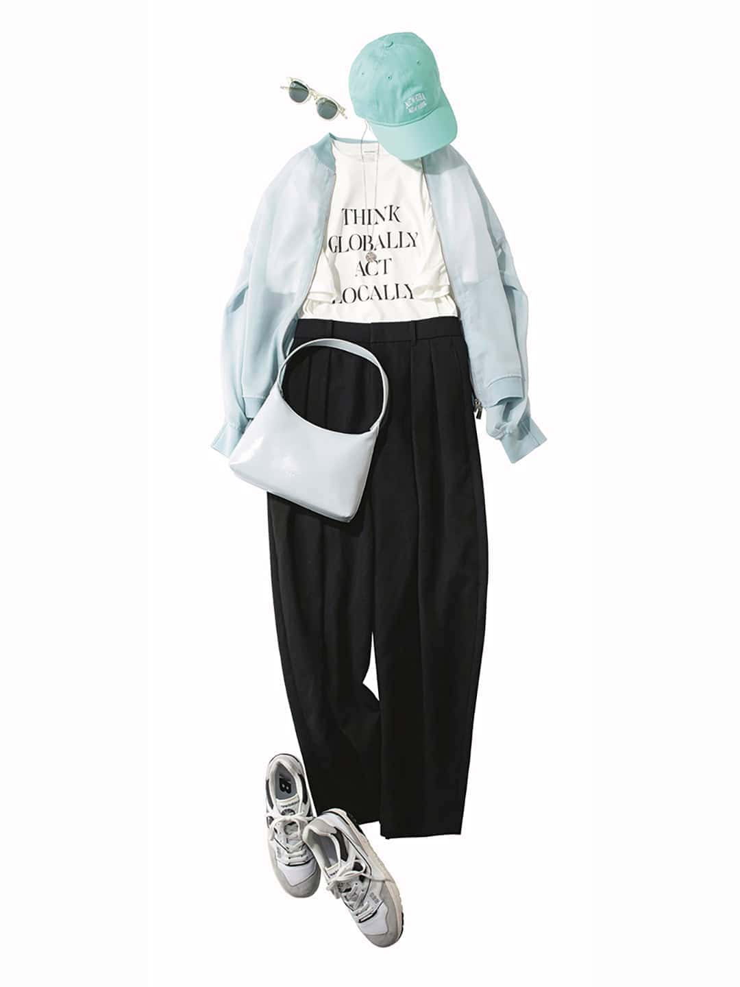 無難になりがちなTシャツ×黒パンツには、華やいだミントカラーのブルゾンとキャップをオン。さわやかなカラーが秋口のマンネリを回避し、スポーティさと清潔感を兼備。白小物でさらに軽快な印象に。