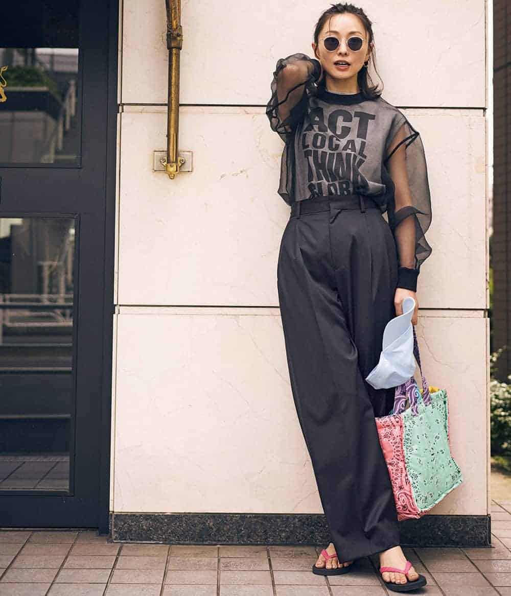 夏は1着でコーデの主役を張っていたロゴTも、透け素材のプルオーバーを重ねればまた新しい表情で着こなせます。トレンドのてんこ盛りでも黒のワントーンでまとめればごちゃつかず、大人に相応しいモードに昇華。