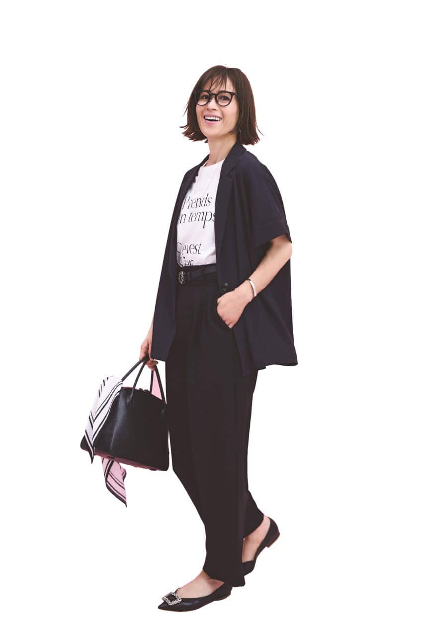 Tシャツにスニーカーを合わせたカジュアルスタイルは、白ジャケット1着で簡単にシフトチェンジ。華やかさ、きちんと感がプラスされます。バッグやアクセでさらに品よく仕上げれば、オフィス仕様のカジュアルに◎。