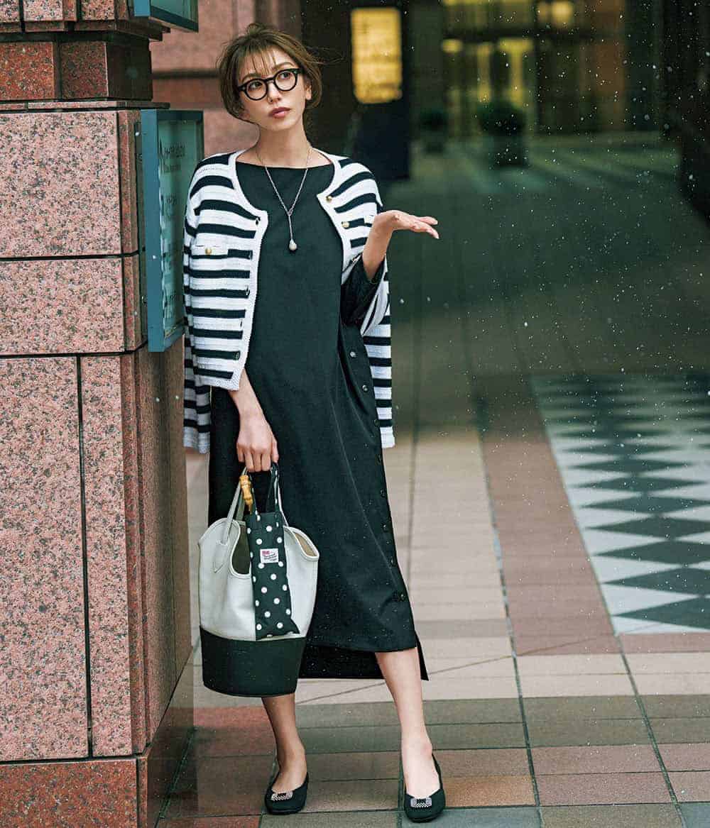 プレーンな黒ワンピは、羽織りのアクセント次第で様々なテイストに着回し可能。ノーカラージャケットのようなきちんと感があるカーデを羽織れば、たちまちオフィスカジュアル仕様に。