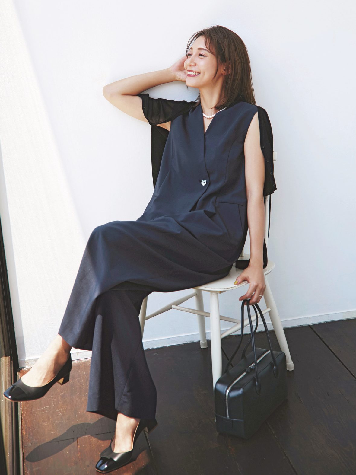 オールインワン¥22,000(ノーク)カーディガン¥14,300(セルフォード/セルフォード ルミネ新宿2店)バッグ¥86,900(メゾン カナウ/ヤマニ)シューズ¥37,400(ファビオ ルスコーニ/伊勢丹新宿本店 本館2階 婦人靴)ネックレス¥121,000(マユオカマツ/マユ ショールーム)リング¥18,700(ニナ・エ・ジュール/ショールーム ロイト)